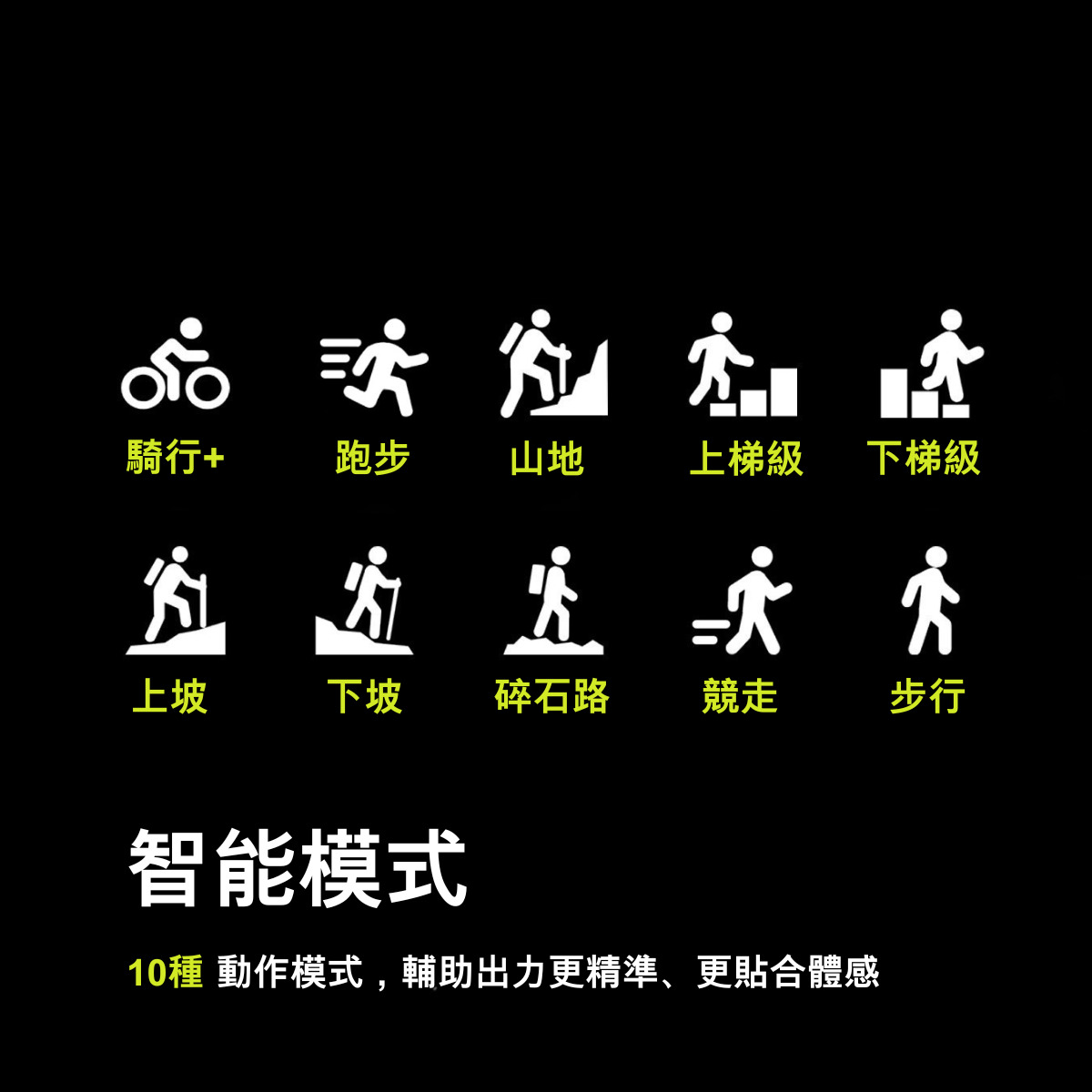 - 智能模式: 騎行、跑步、下梯級、上梯級、競走、下坡、上坡、山地、碎石路及步行