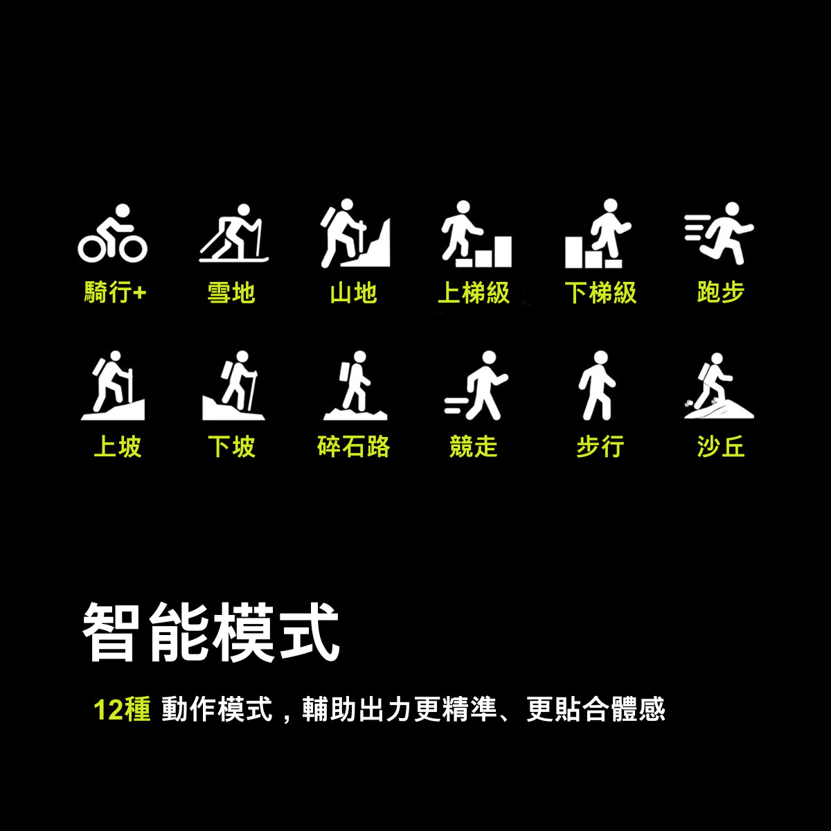 - 智能模式: 騎行+、跑步+、沙丘、雪地、下梯級、上梯級、競走、下坡、上坡、山地、碎石路及步行