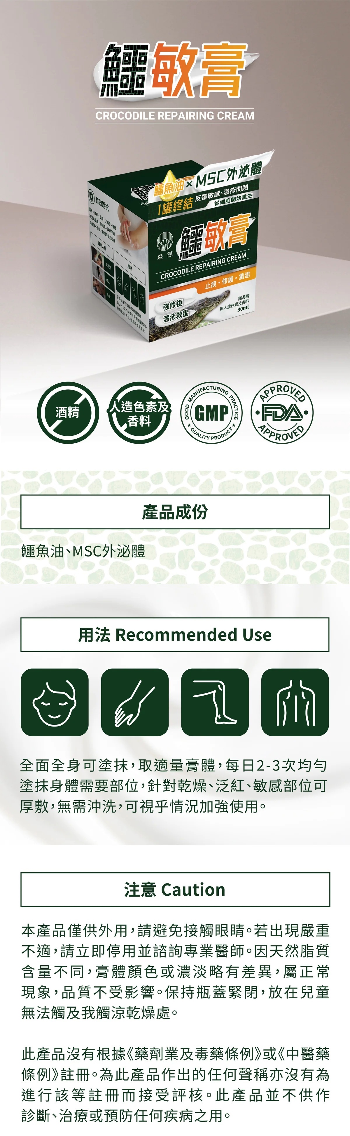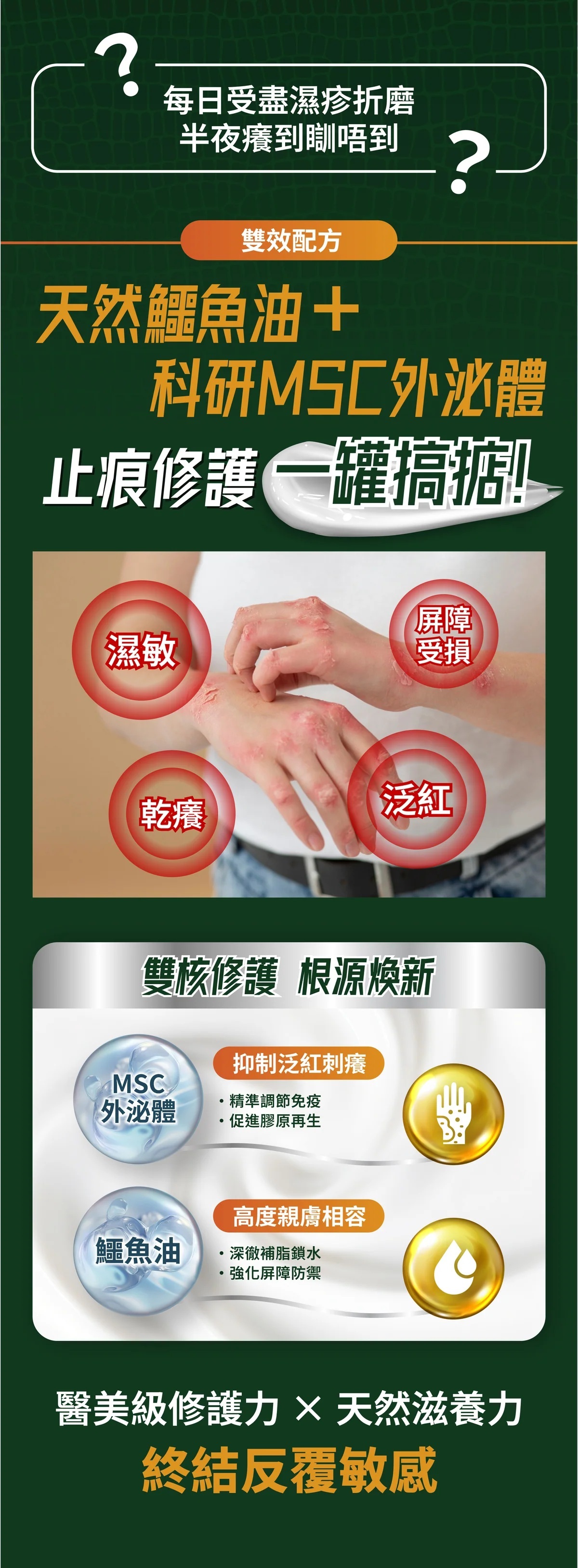 隨著年齡、環境壓力與皮膚屏障受損,肌膚陷入慢性發炎循環,導致泛紅、乾癢、粗糙與敏感反覆。鱷敏膏結合MSC外泌體與極罕鹹水鱷魚油雙核心修護科技,從細胞根源調節免疫、修復屏障,終結肌膚反覆敏感問題!
