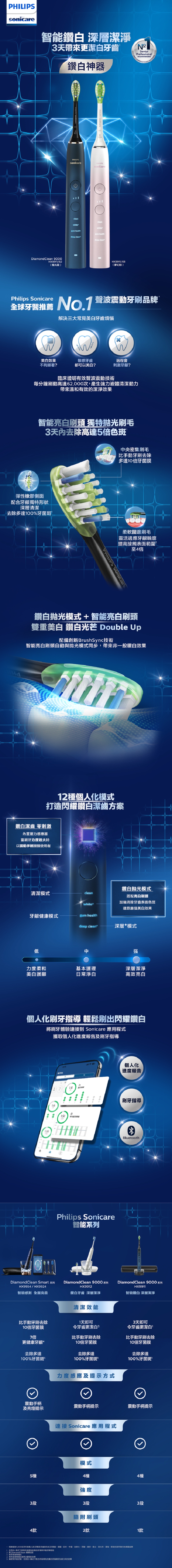 - 藍牙連接Sonicare App應用程式,偵測和同步刷牙,紀錄每日刷牙數據,提供個人化進度報告及刷牙指導