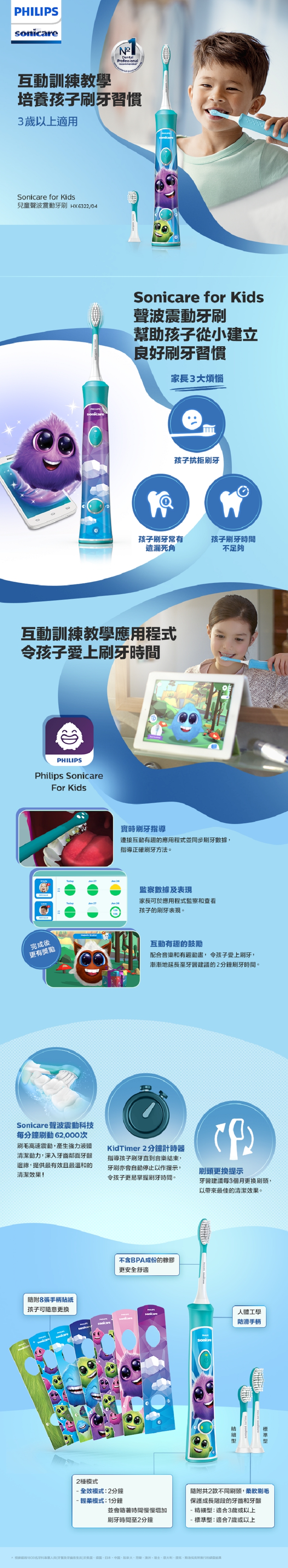 - 配合互動訓練教學應用程式,以有趣動畫實時刷牙指導,幫助小朋友掌握更有效的刷牙方法和建立良好刷牙習慣