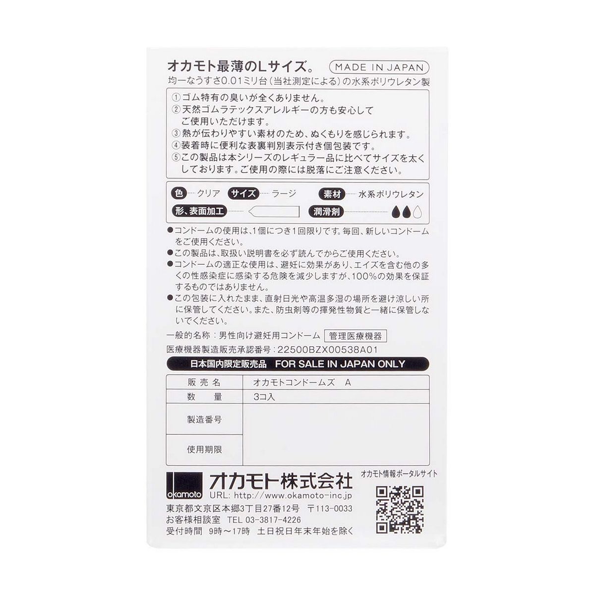 岡本 - 0.01 大碼 (日本版) 3 片裝 PU 安全套