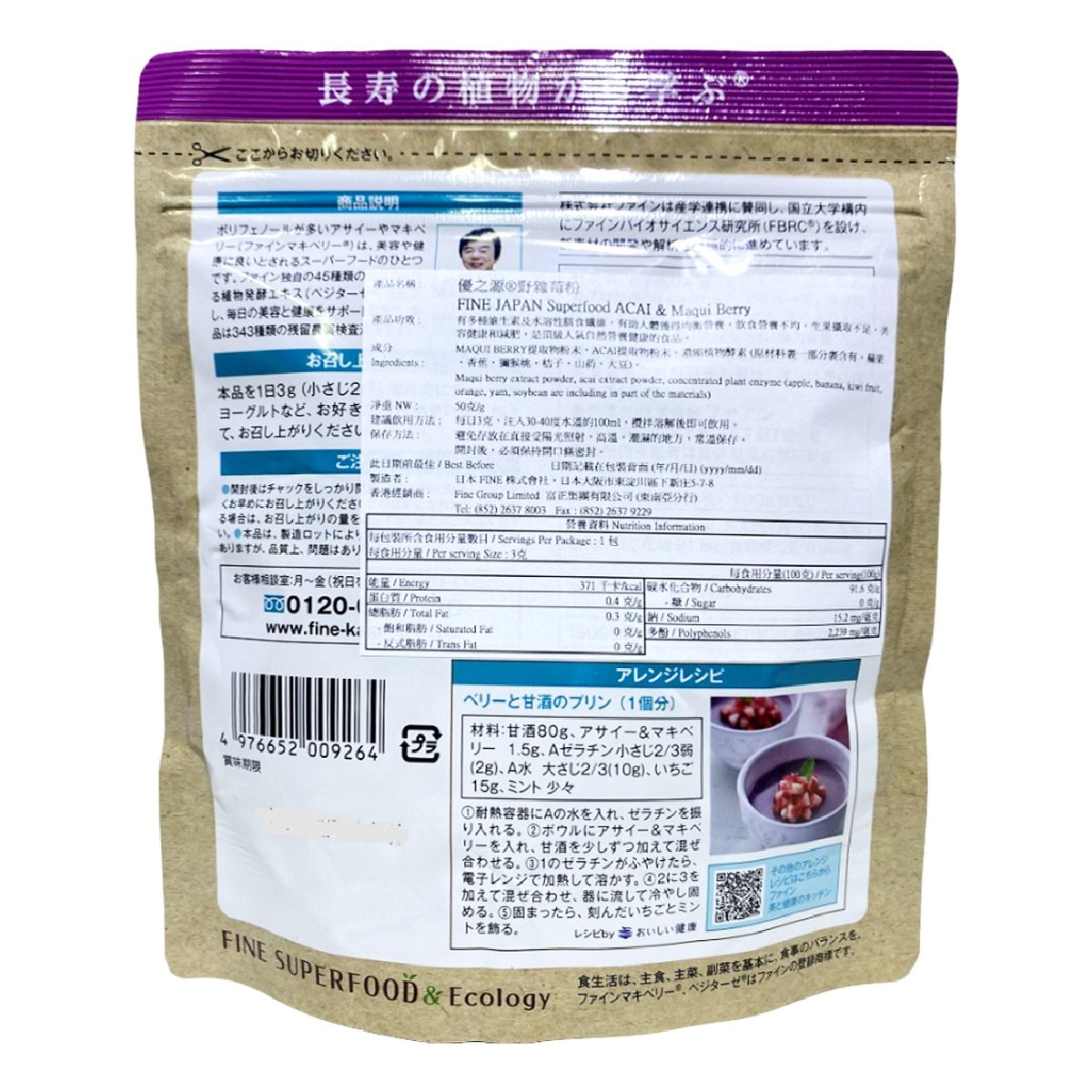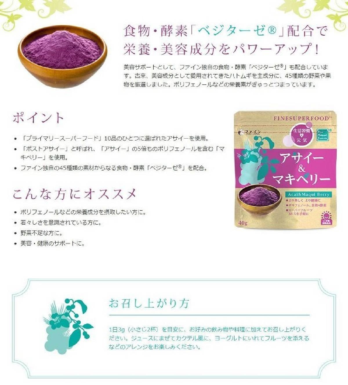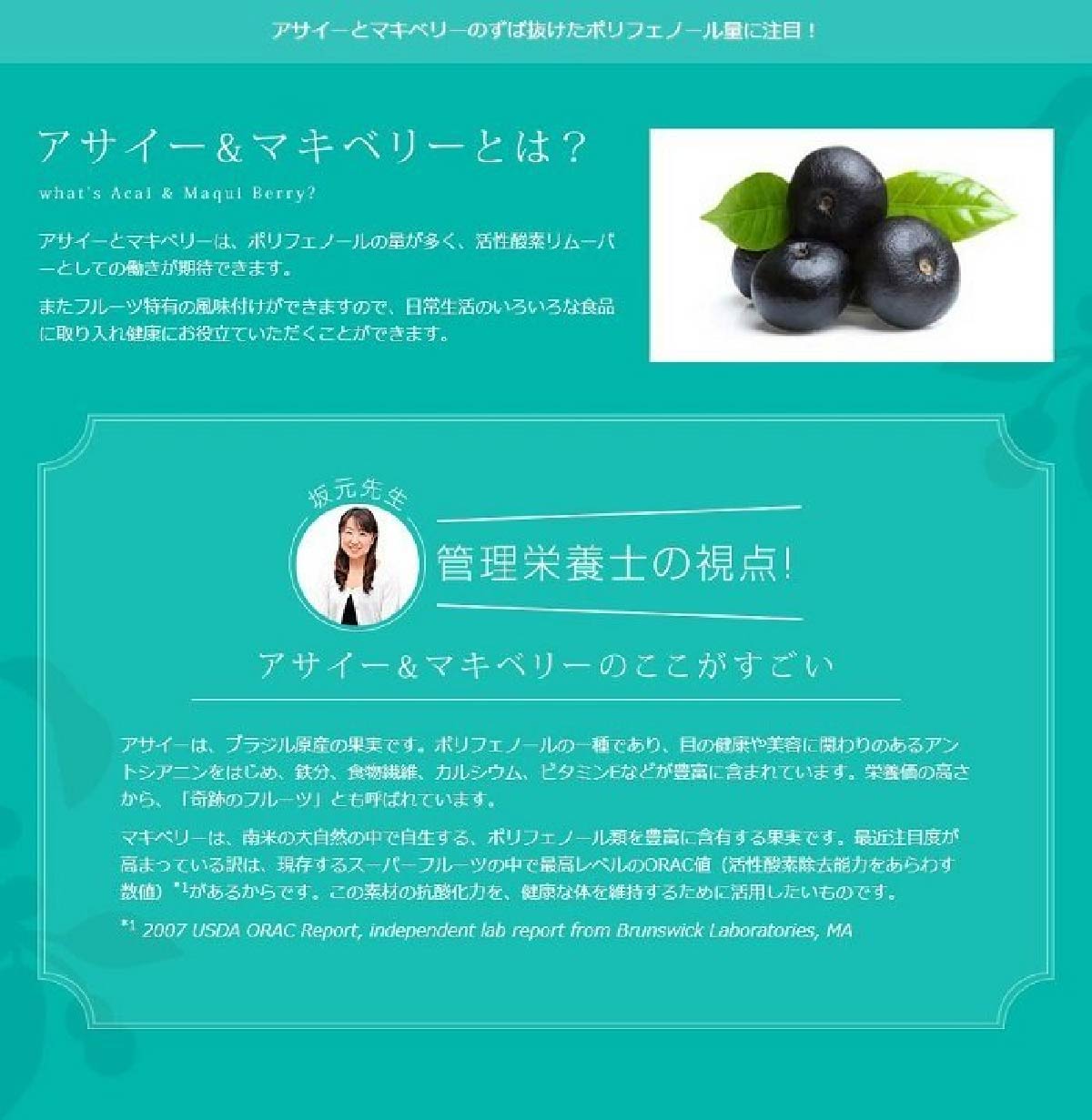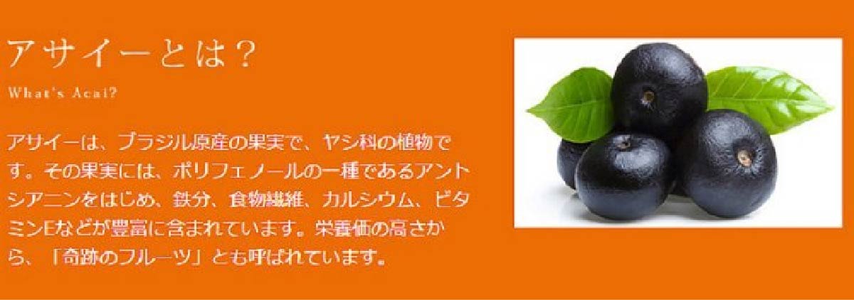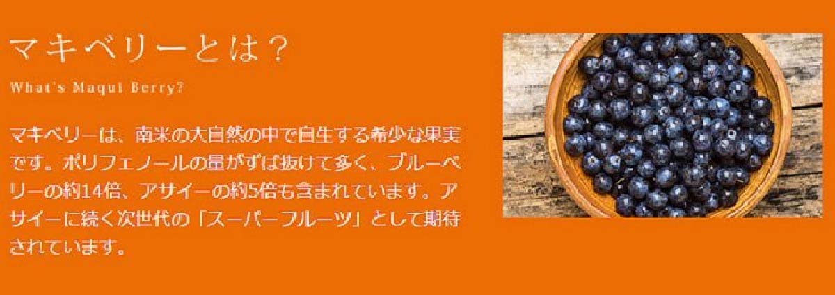 <ACAI> 巴西產的天然水果,含有花青素的一種多酚素材,10種產品中精選出來,鈣及維他命E等成分,<MAQUI BERRY> 南米大自然中生產的稀少水果,自家開發的45種精選素材的酵素,含有豐富大量食物纖維,有助抗氧化,氨基酸及清除自由基。