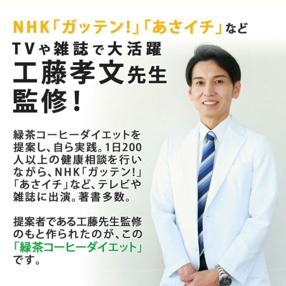 日本瘦身專家工藤孝文是專研醫生,他指出:「綠茶咖啡減肥茶飲特別針對三餐外食、生活忙碌、沒有控制飲食或運動的人。即使需要控制體重以遠離慢性病的人都非常適合不過。」工藤孝文醫生亦曾經親身試法,測試前他的體重為92KG,測試期間並沒有強逼自己做運動,刻意控制飲食。在幾乎跟日常生活沒差情況下,只依靠在餐前,一天飲用三杯綠茶咖啡,便可有效輕鬆地10個月內減掉25kg。