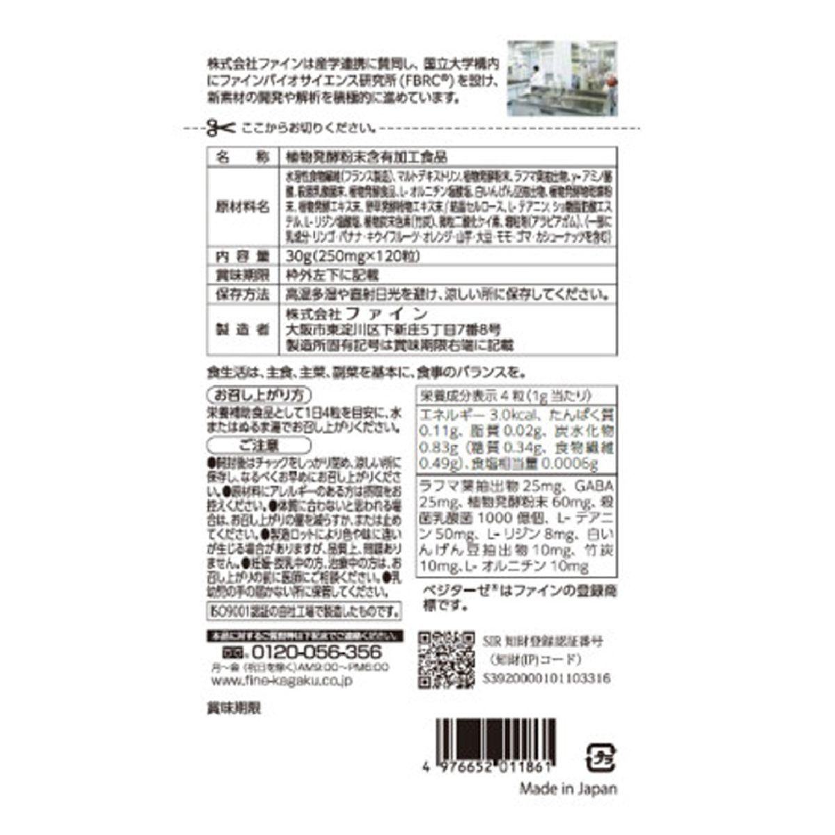 水溶性膳食纖維(法國製造),麥芽糊精,植物發酵粉,羅布麻葉提取物,γ-氨基丁酸,殺菌乳酸菌粉末,植物發酵,L-鹽酸鳥氨酸,白腎豆提取物,植物發酵物乾燥粉,植物發酵提取物粉,野草發酵提取物粉/結晶纖維素,L-茶氨酸,蔗醣脂肪酸酯,L-賴胺酸鹽酸鹽,植物炭末色素(竹炭)、二氧化矽素微粒、增稠劑(阿拉伯膠)、(含乳製品成分、蘋果、香蕉、奇異果、橘子、山芋、大豆、桃子、芝麻、腰果)