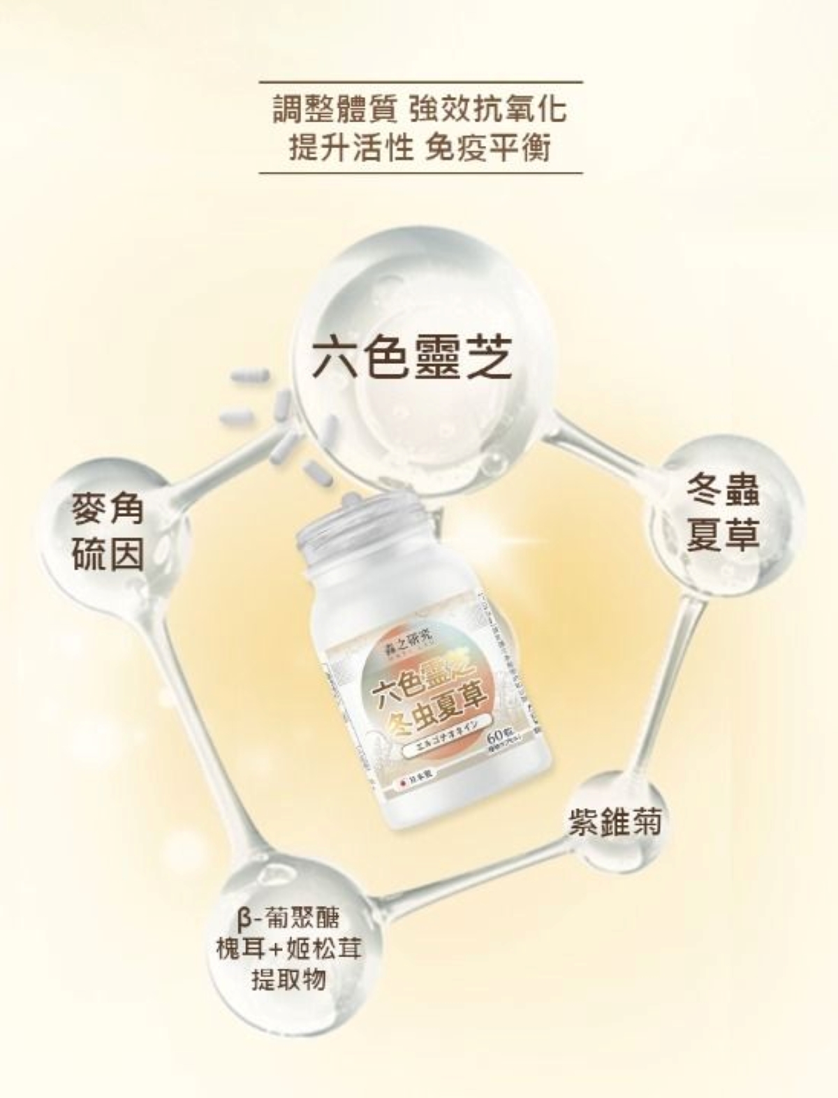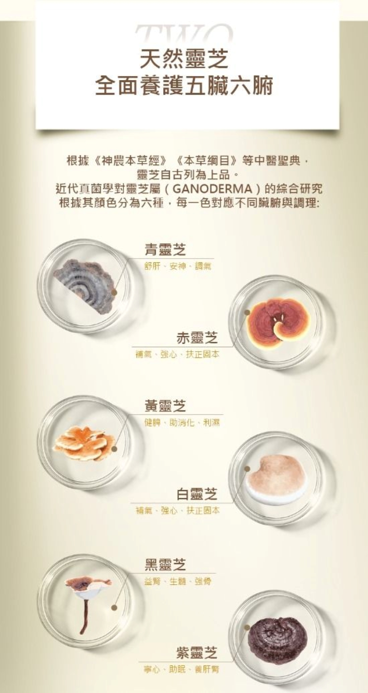 嚴選赤芝、黑芝、青芝、白芝、黃芝、紫芝,平衡五臟六腑,強化免疫,助身體回復自然修復力。