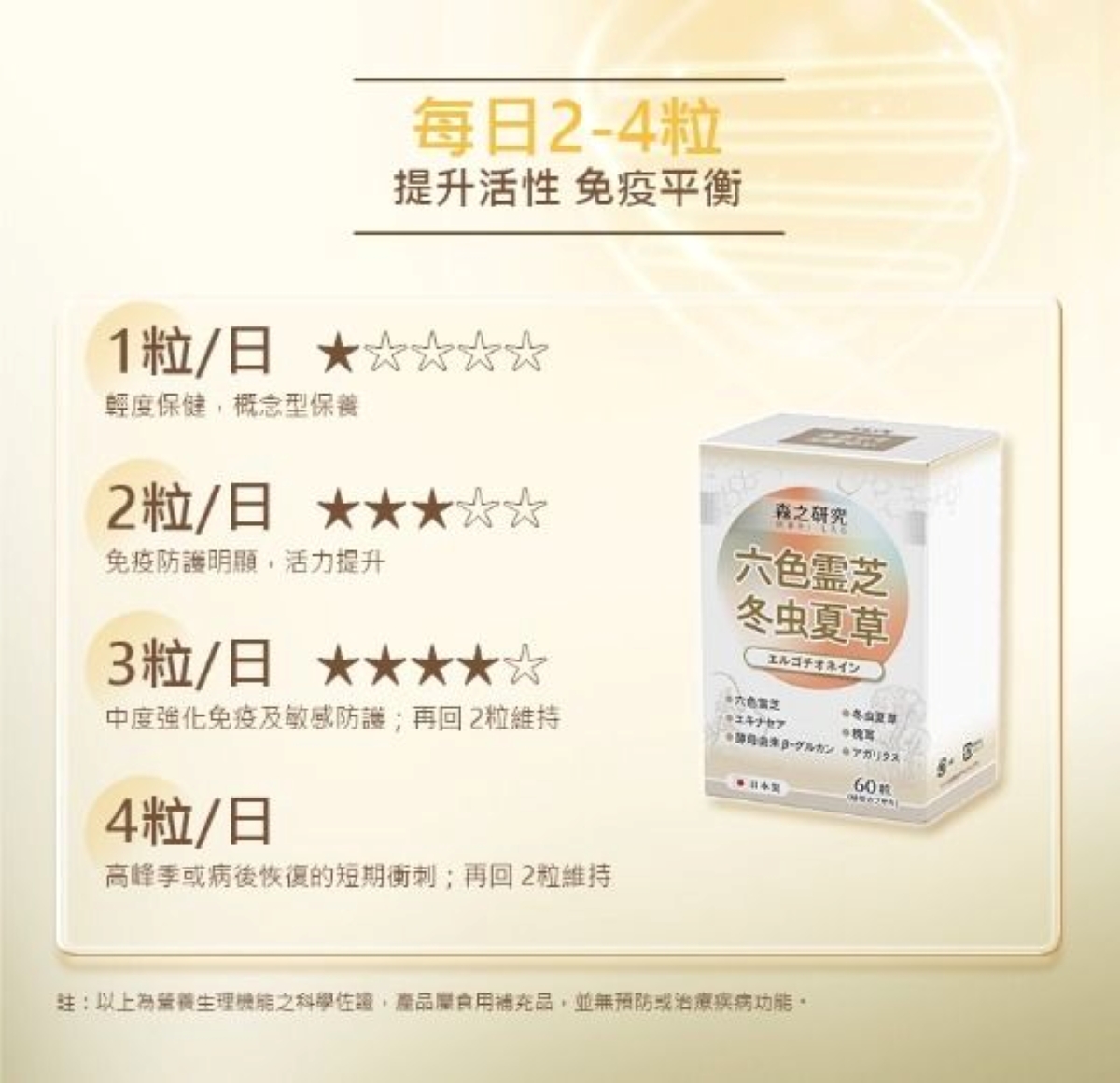 4 粒/日 ★★★★★ 高峰季或病後恢復的短期衝刺;再回 2粒維持