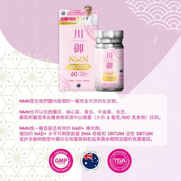 川御 NMN18000+ 含高穩定性及濃縮NMN(β-煙醯胺單核苷酸),可快速補充體內NAD+水平及維持健康的線粒體功能和能量代謝。川御將NMN結合了特有天然酶法激活NMN及多項頂尖學府的醫學研發成果,增加體內快速吸收及穩定釋放*。NMN和NAD+被公認為緩減衰老過程的要素,代表了逆齡及長壽革命史上的重要突破,適合任何想抗衰逆齡、重拾年輕健康的人士服用。  川御 NMN18000+ 提供嶄新的逆齡體驗,針對每28日#的細胞更新週期,逆轉身體年齡,改善10大衰老煩惱。