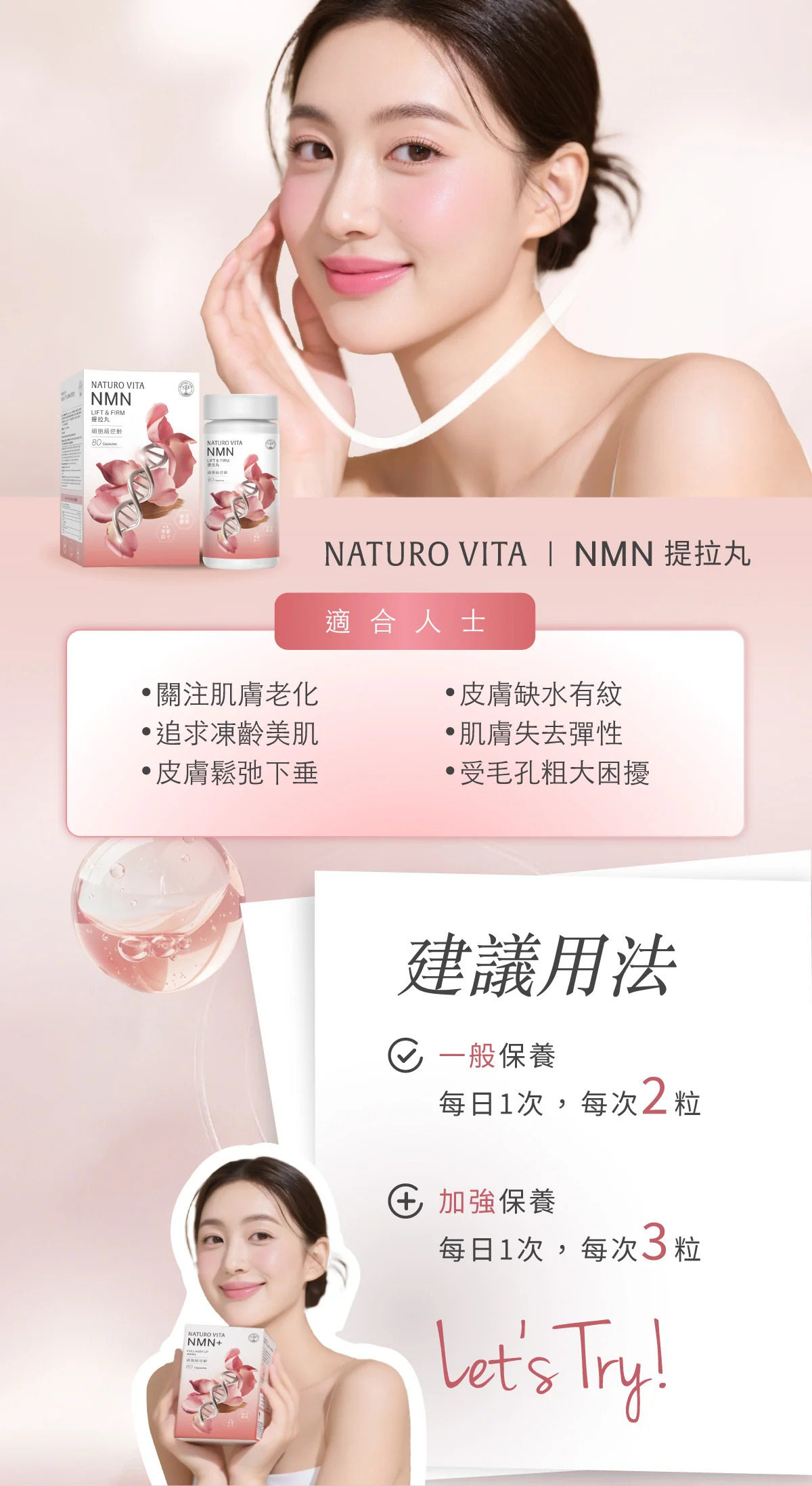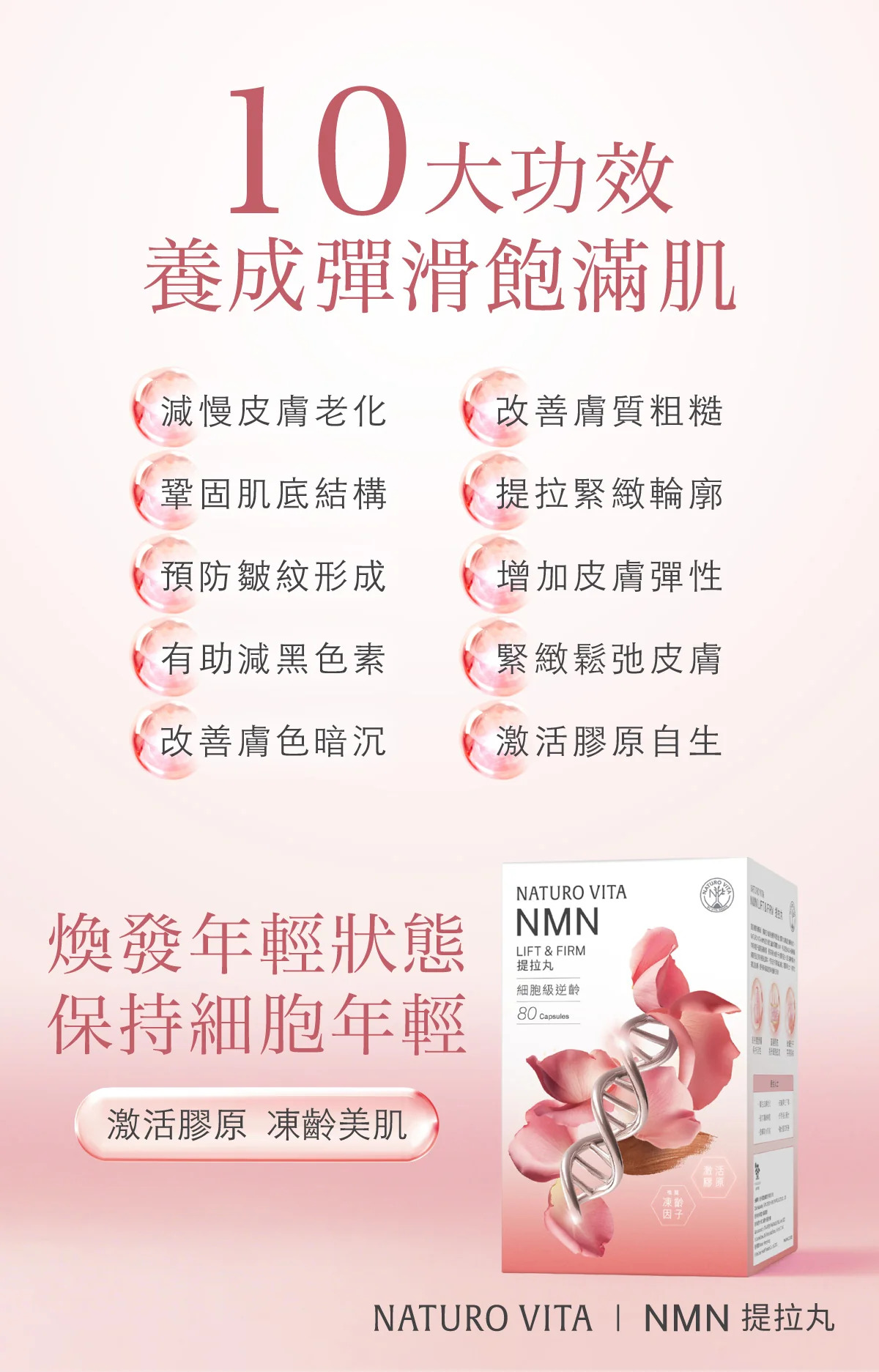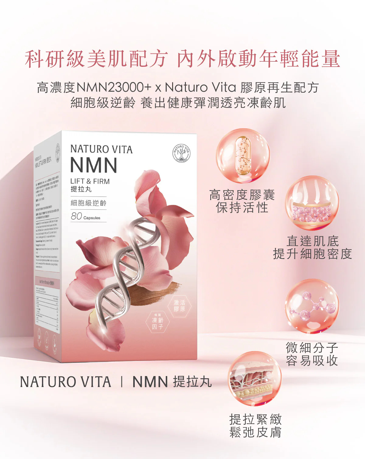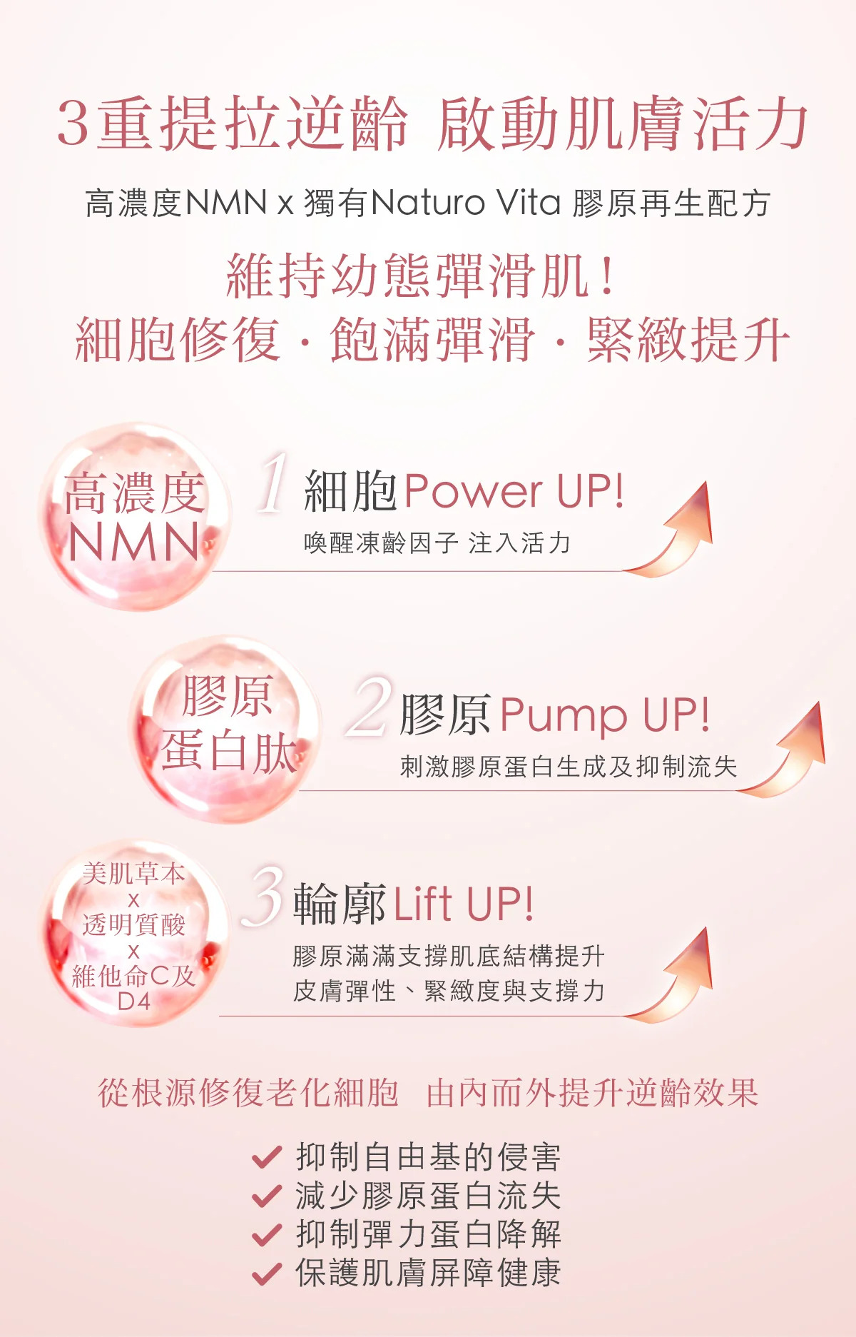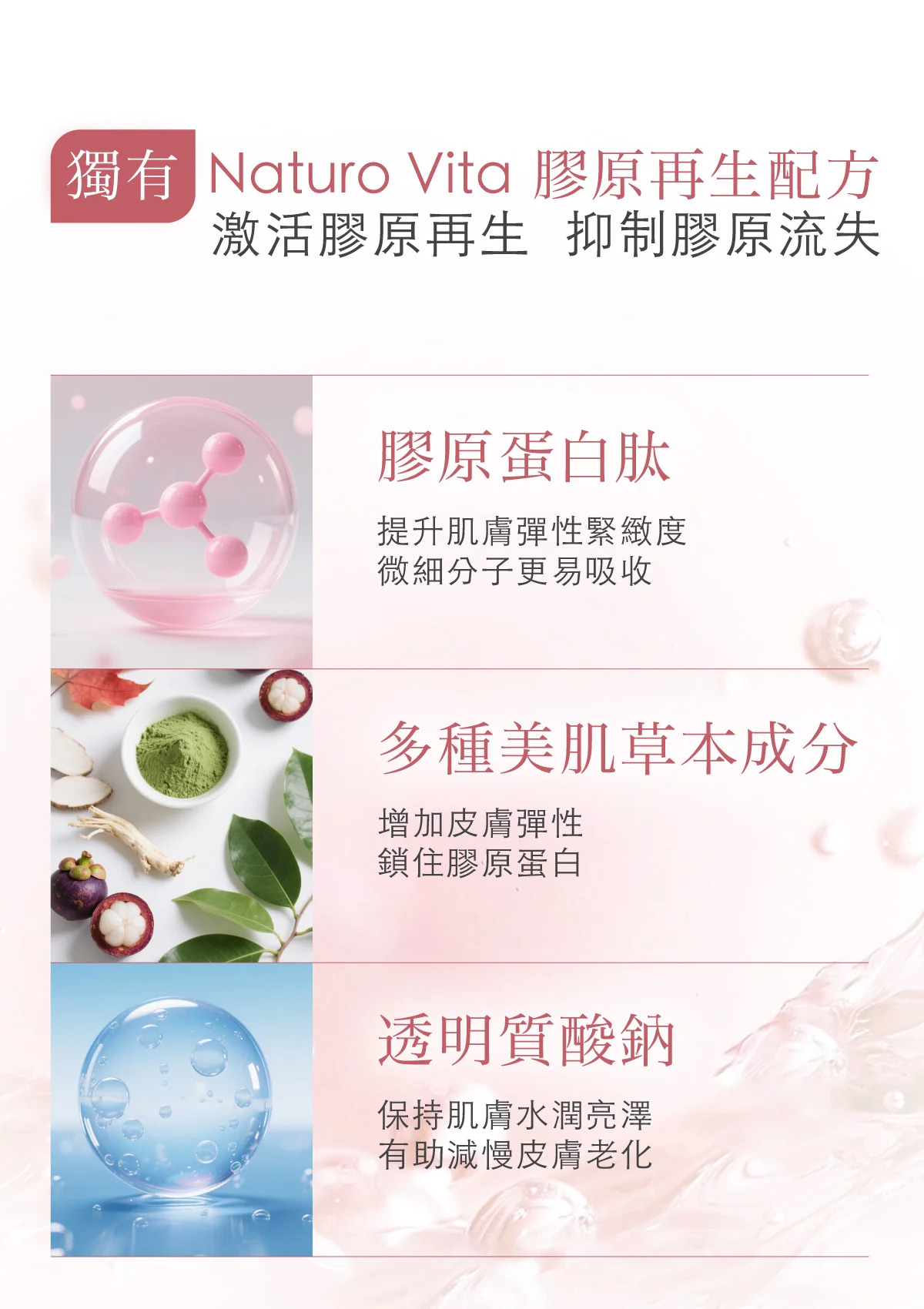 ​β-煙酰胺單核苷酸(β-NMN),Naturo Vita 膠原再生配方(膠原蛋白肽,綠茶提取物,黃芪提取物,漆黃素,莽吉柿皮提取物,透明質酸鈉,白朮提取物) ,膠囊(普魯蘭多糖,水,膠凝劑(407, 508) ,色素(171)),玉米澱粉,維他命C,維他命D3,抗結劑(470(iii))。本產品含有魚類製品。