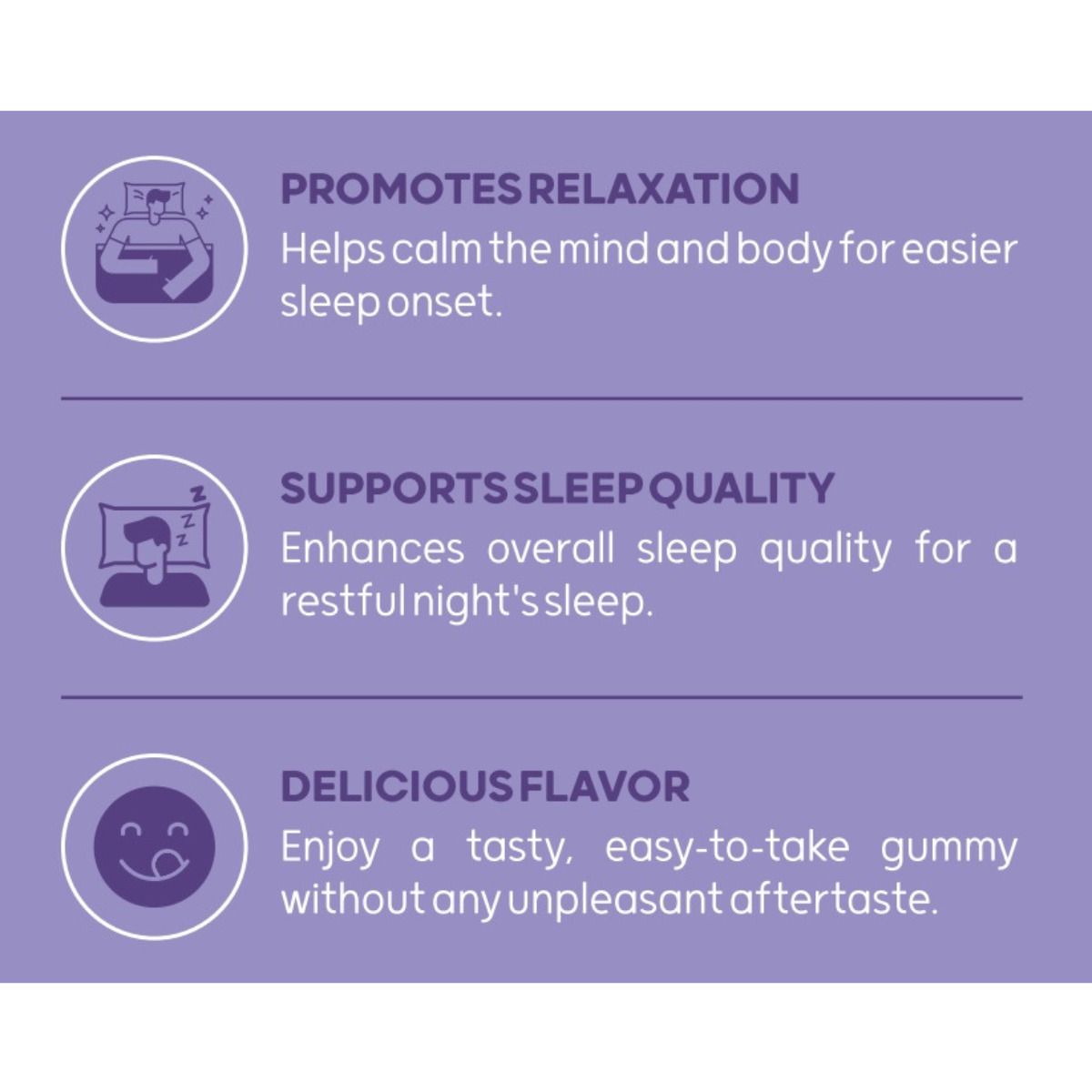• 這些美味的軟糖非常適合偶爾失眠的人,它們能幫助您安睡一夜,清晨神清氣爽。每一口都讓您擁有安穩的睡眠!