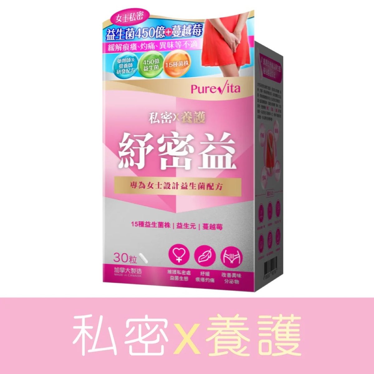 - PureVita 紓密益由專業藥劑師及營養師調配,專為女性設計的益生菌配方。