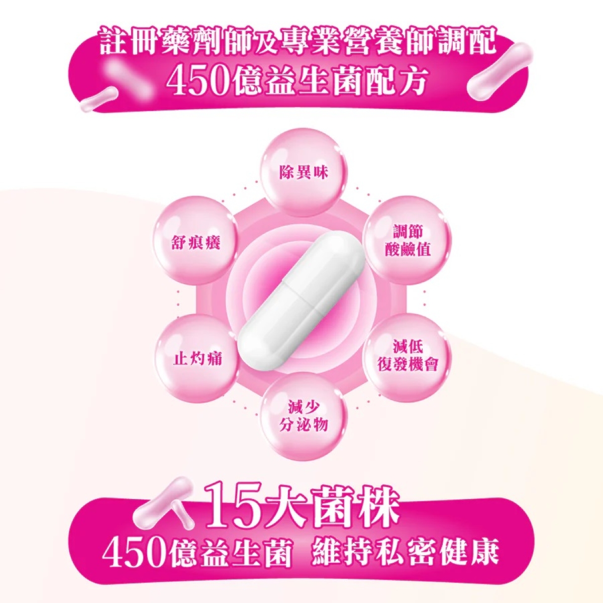 - 全面養護女士私密部位,450億益生菌配方,添加蔓越莓及益生元,有助維護私密益菌生態,對抗惡菌,抑制惡菌黏附,迅速紓緩痕癢、灼痛,改善異味、分泌物問題,減少感染復發機會。