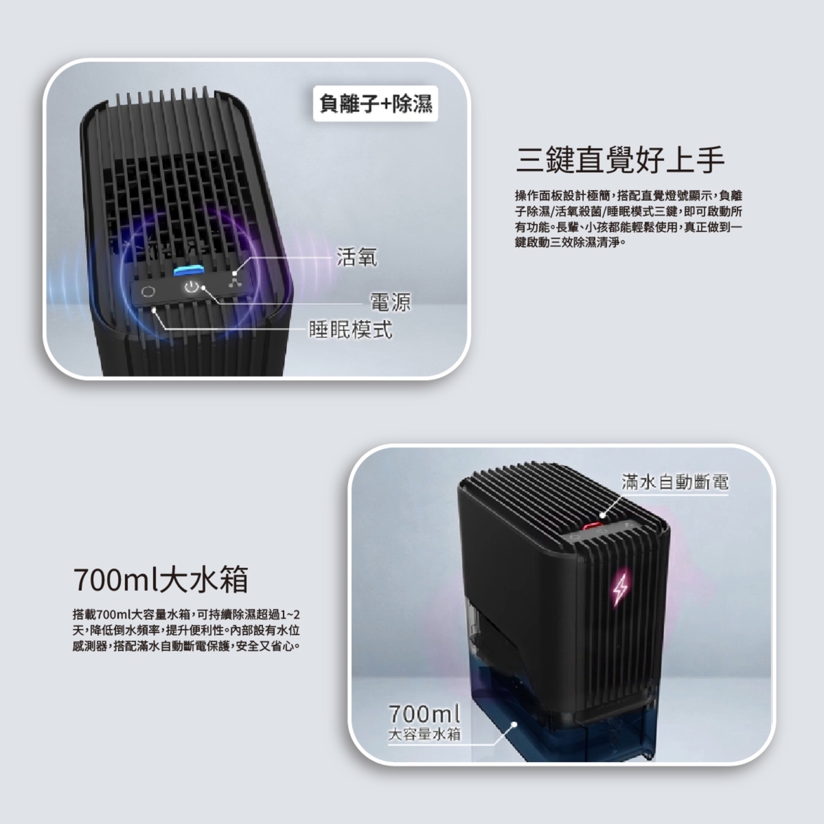 • 水箱容量: 700ml(水滿警示+自動斷電)
