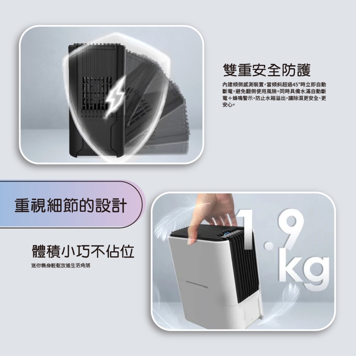 • 除濕能力: 高檔 500ml/日、低檔 350ml/日(30°C / 80% RH)