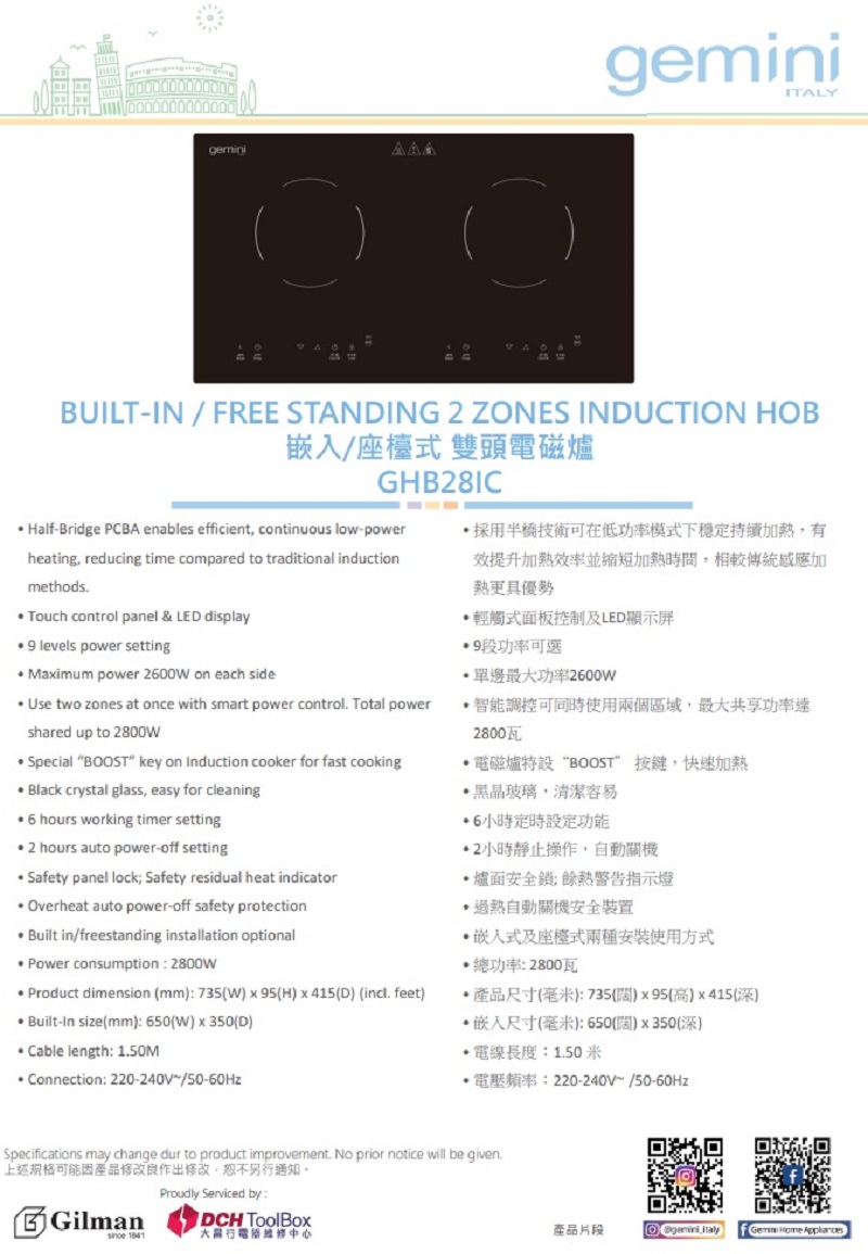 Gemini - GHB28IC 2800W 嵌入/座檯式 雙頭電磁爐 GHB28IC Gemini - GHB28IC 2800W 嵌入/座檯式 雙頭電磁爐 Gemini - GHB28IC 2800W 嵌入/座檯式 雙頭電磁爐
