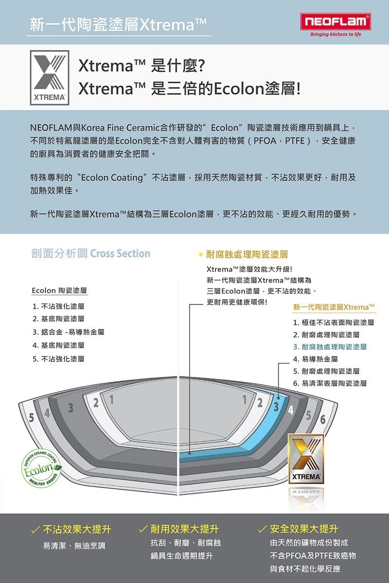 - Xtrema是陶瓷塗層升級版,是由陶瓷原料(二氧化矽) 所製成,主要成份是以天然的沙和石經成,冇別於傳統使用PTFE (鐵氟龍) 的鍋具,讓您使用起來安全健康