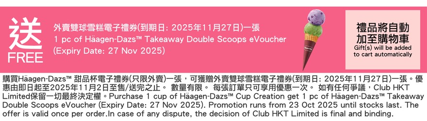 - 憑相關的電子禮券可免費換取Häagen-Dazs™外賣甜品杯一客