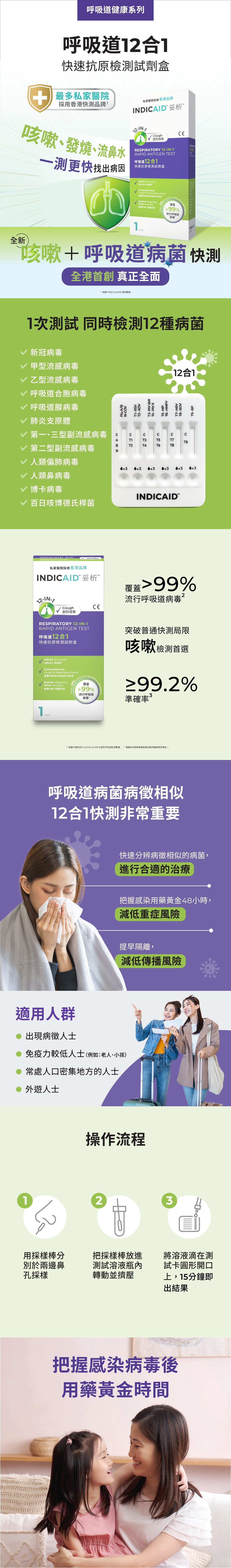 可檢測12種常見呼吸道病菌快測,包括博卡病毒和百日咳博德氏桿菌的抗原, 近7成私家醫院選用的香港快測品牌, 無痛淺層鼻拭子採樣,15分鐘即出結果