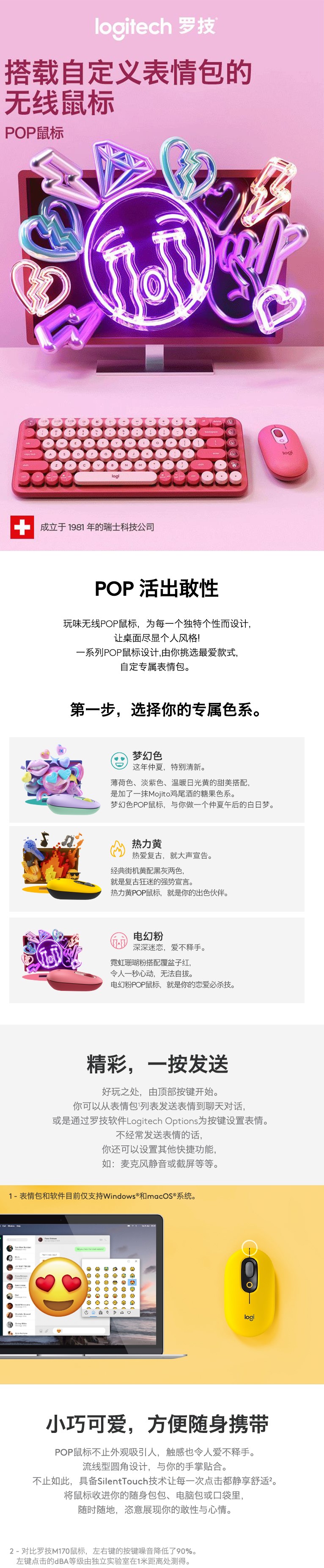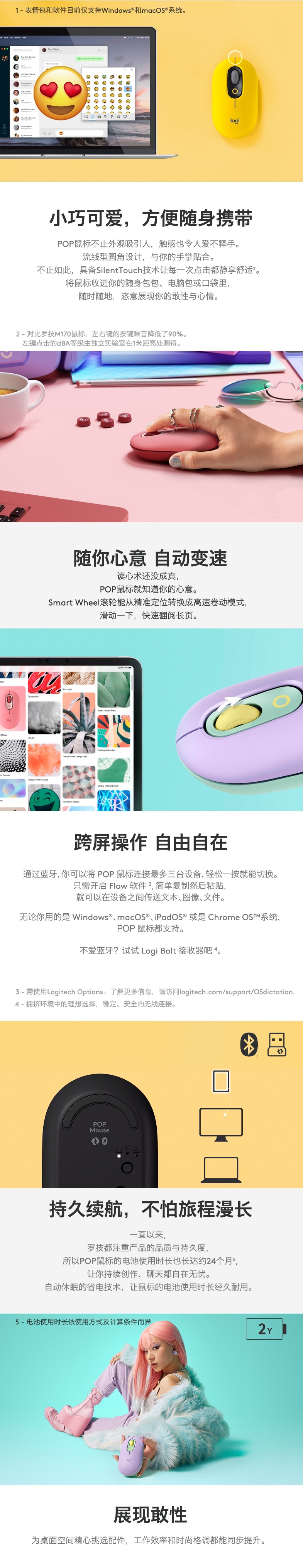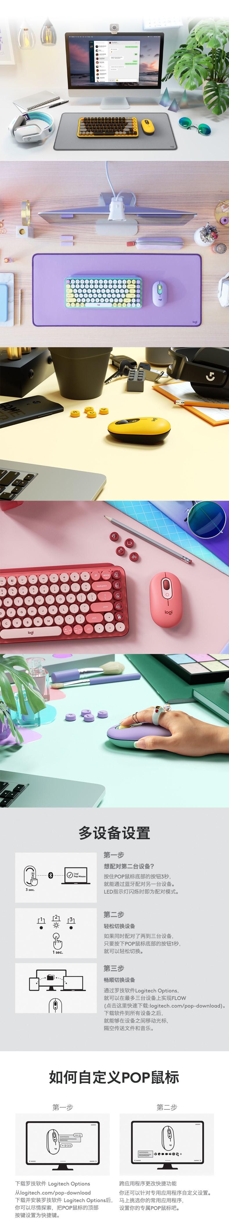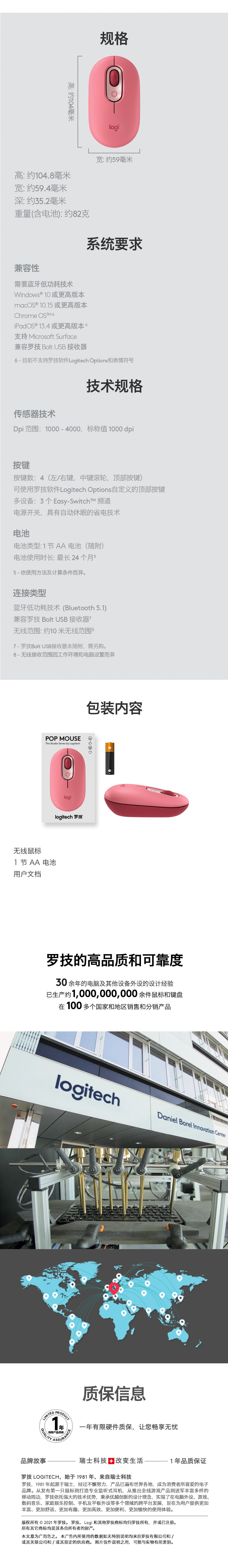 - 安靜的POP Mouse,具備獨家的SilentTouch靜音技術,助你在幾乎任何表面上進行追踪。