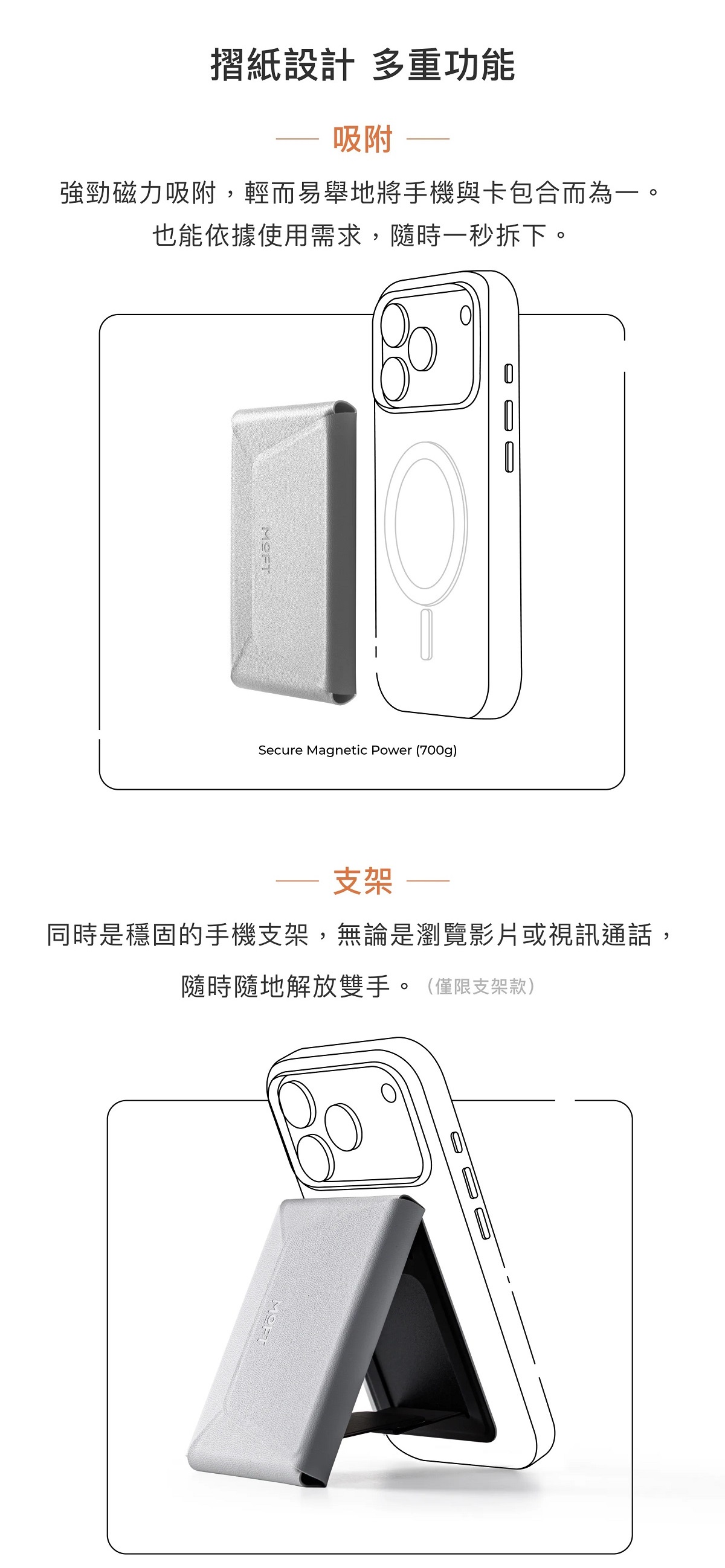 手機支架必須與支援 MagSafe (或有磁吸) 的手機殼一起使用,吸力會更強。若使用不兼容 MagSafe 的手機殼可能會影響磁吸強度。