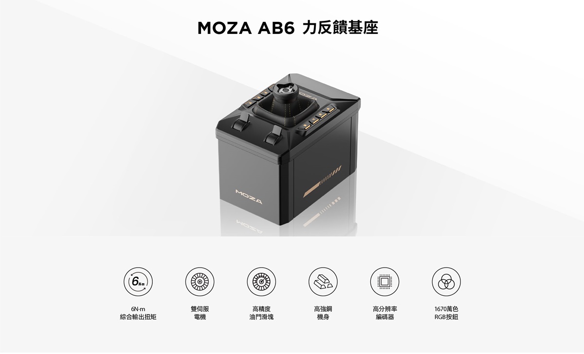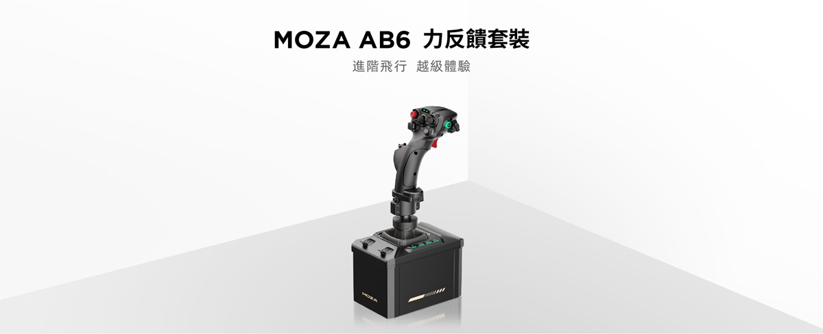 MOZA AB6 套裝包含一個高扭矩 6 N·m 力回饋底座和高精度 MHG 飛行搖桿,提供精準的力回饋、29個可編程訊號以及沉浸式飛行控制體驗。其緊湊的太空船風格設計支援桌面夾(隨附)、可選底座或直接硬安裝,可適應任何駕駛艙或桌面環境。相容於 MOZA 和部分第三方飛行搖桿,以及主流飛行模擬器。