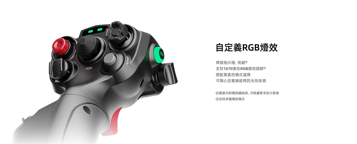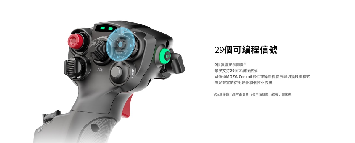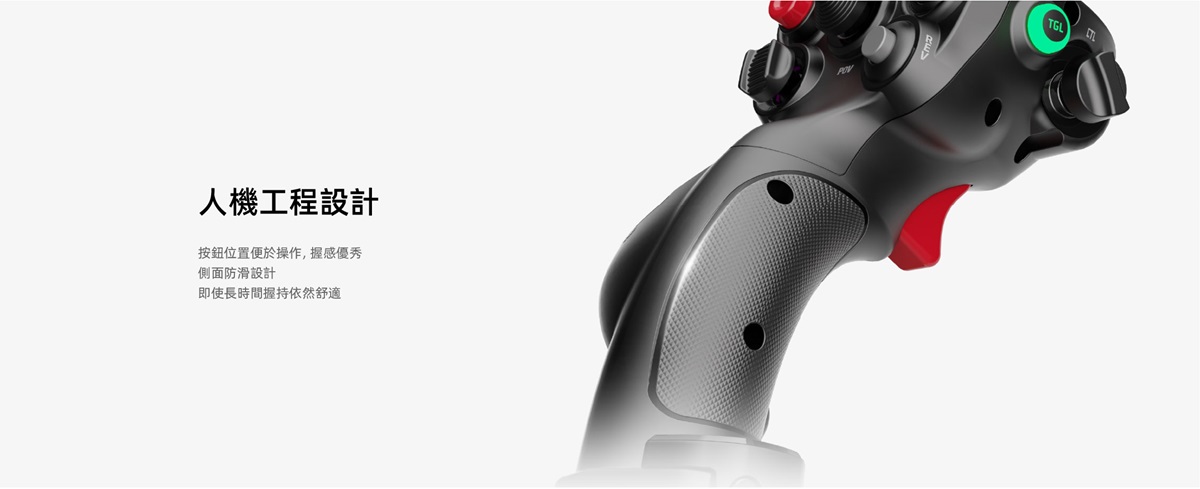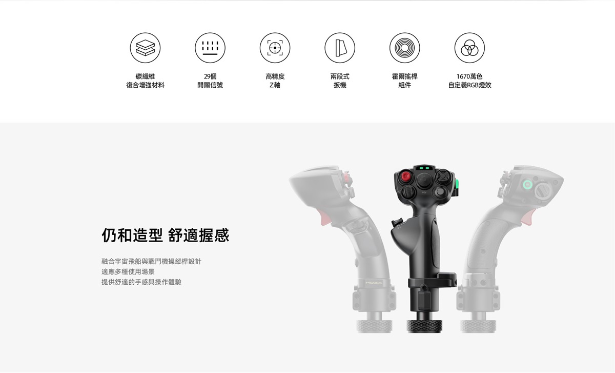 MOZA MHG飛行搖桿採用強化碳纖維複合材料打造,兼具耐用性與精準度。它配備霍爾效應感測器、兩段式扳機、可自訂RGB燈光以及全面的控制佈局,旨在為各種飛行場景帶來身臨其境的體驗。