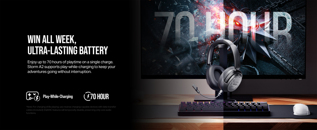 - 超長電池續航力高達 70 小時,支援邊玩邊充電功能