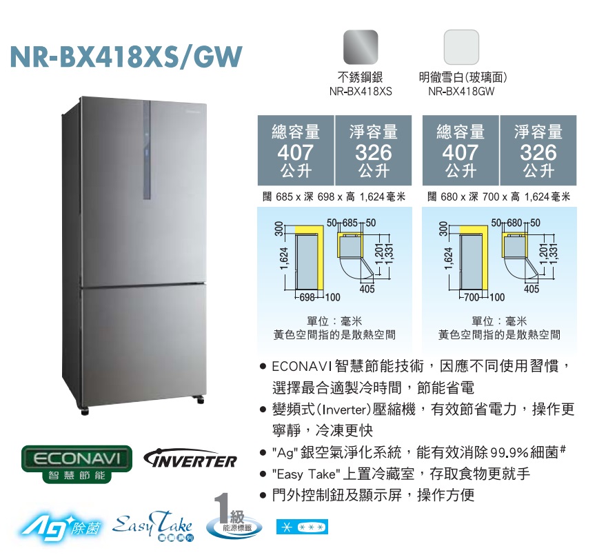 Panasonic 樂聲牌 - ECONAVI 智慧節能雙門雪櫃<明徹雪白(玻璃面) / 不銹鋼銀> NR-BX418