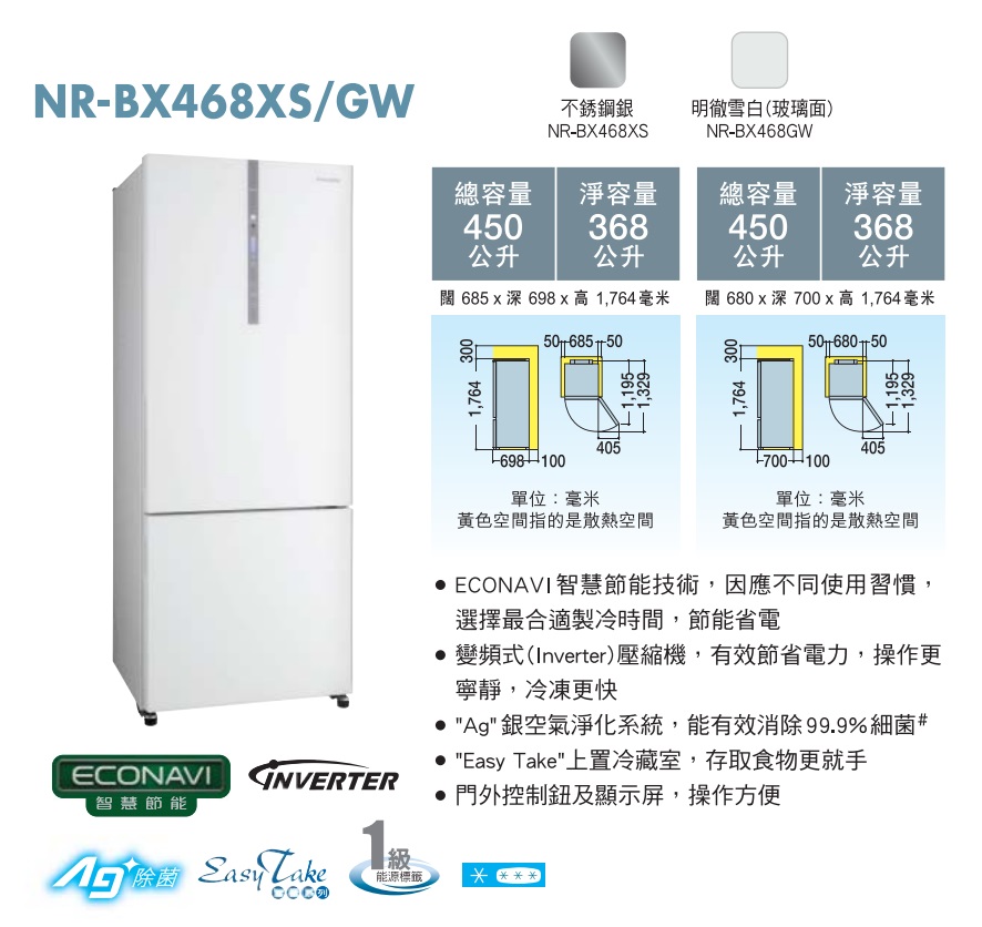 Panasonic 樂聲牌 - ECONAVI 智慧節能雙門雪櫃<明徹雪白(玻璃面) / 不銹鋼銀> NR-BX468