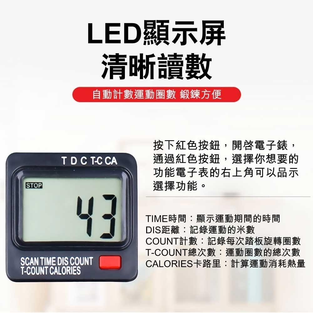 - 配件:數字顯示屏、加寬腳踏板、踏板穩定帶、阻力調節按鈕、調節鬆緊卡扣、後腳防滑底座、前腳防滑底座
