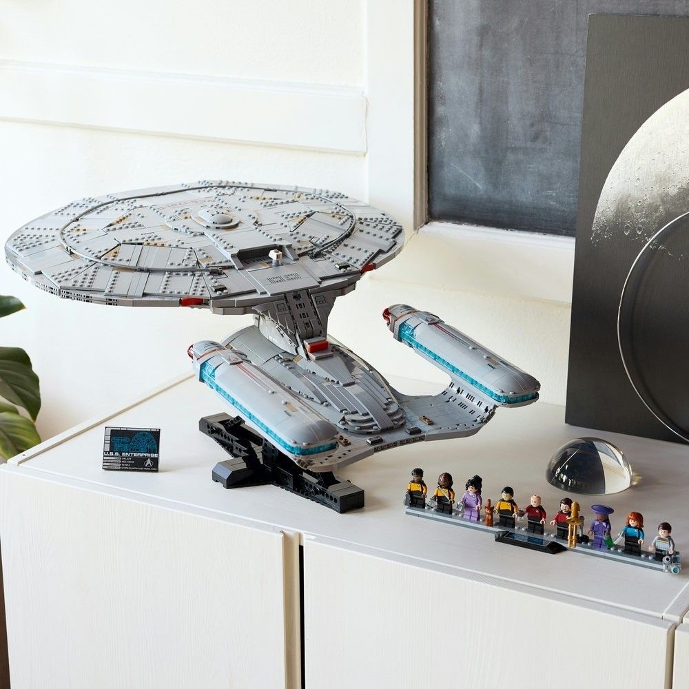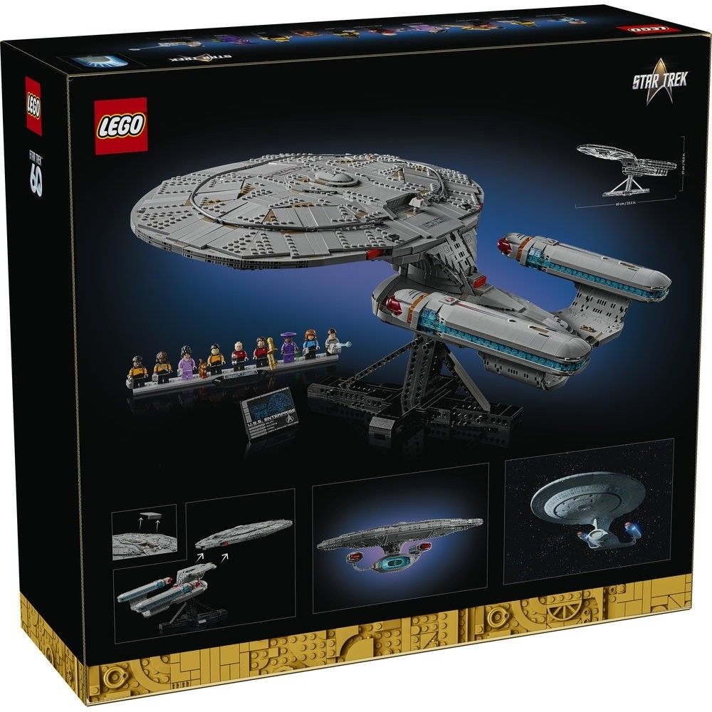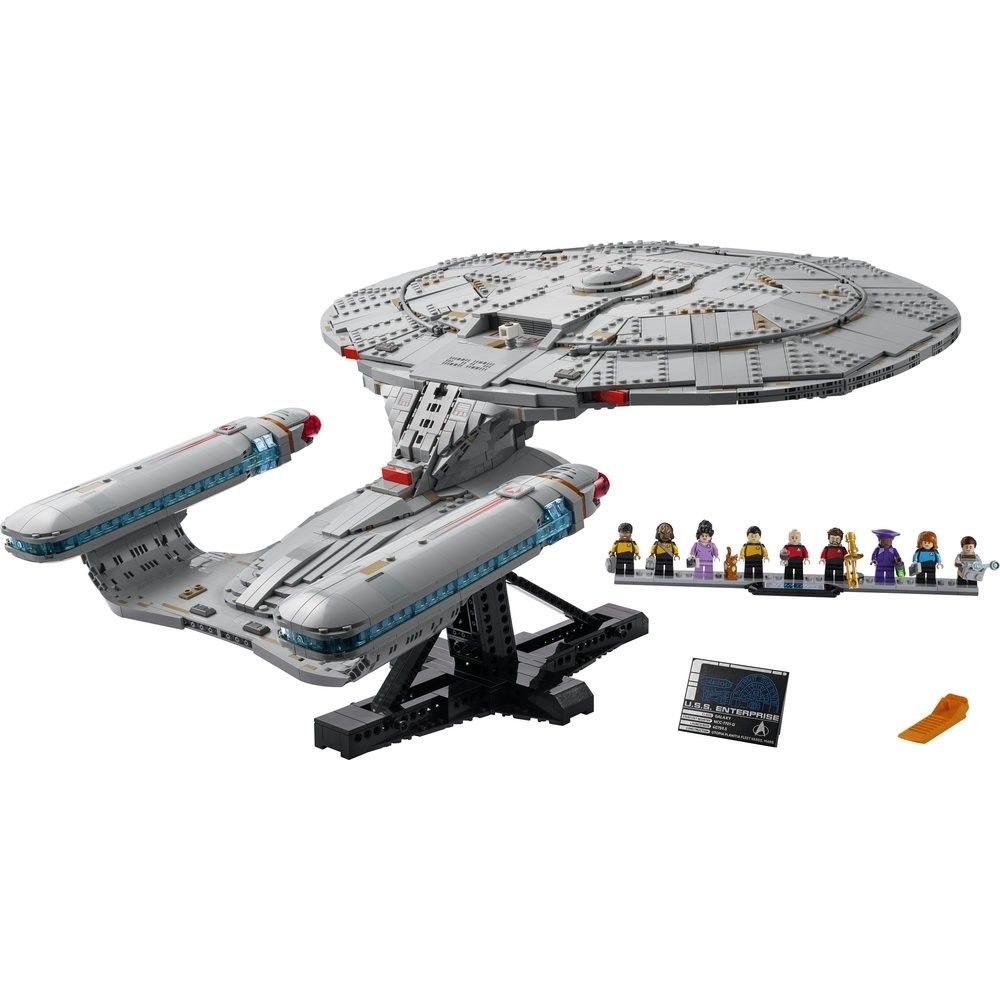 • 盒裡有什麼?-內含所有必需品,讓你拼砌精緻的樂高® 模型,詮釋傳奇星艦 U.S.S. Enterprise NCC-1701-D 星艦、2 個穿梭艙,此外還有 9 隻附主題配件的人仔