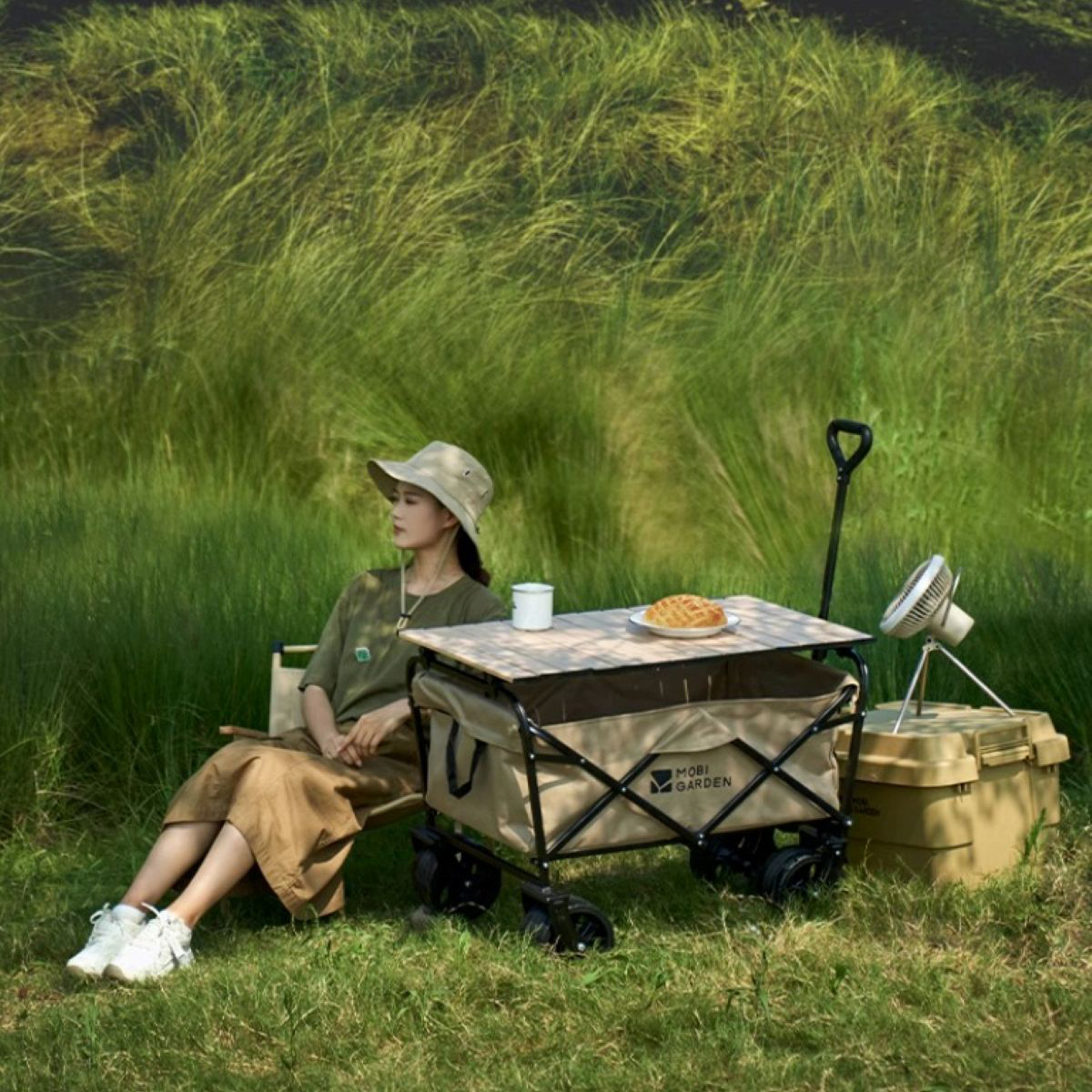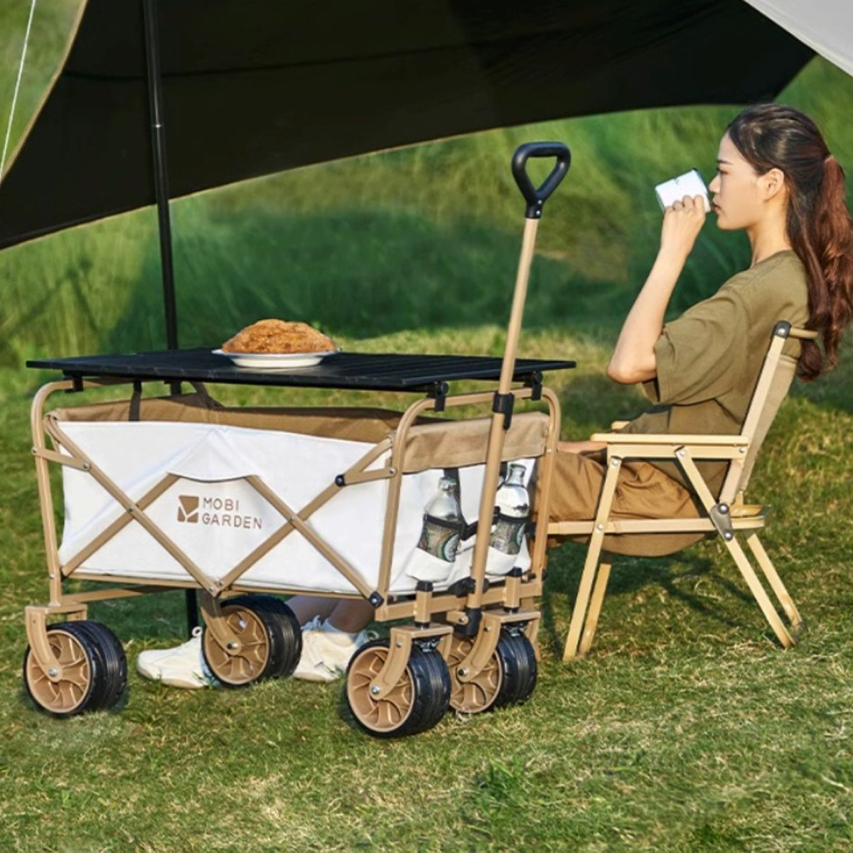 推車秒變露營桌,踩緊剎車,桌子穩當不跑滑。