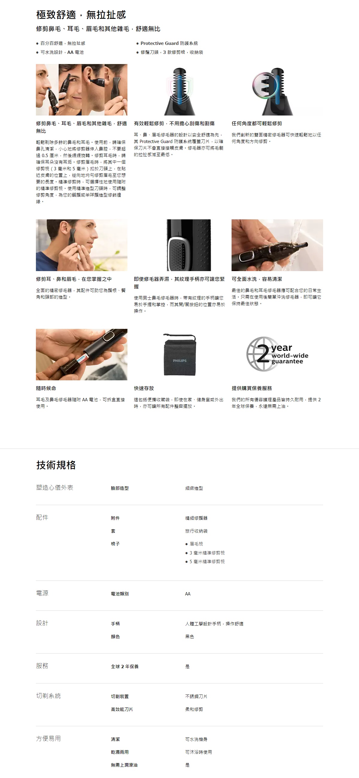 - PrecisionTrim 雙面刀片精修技術,更準確快速地修剪不同角度和方向的鼻毛、耳毛和眉毛