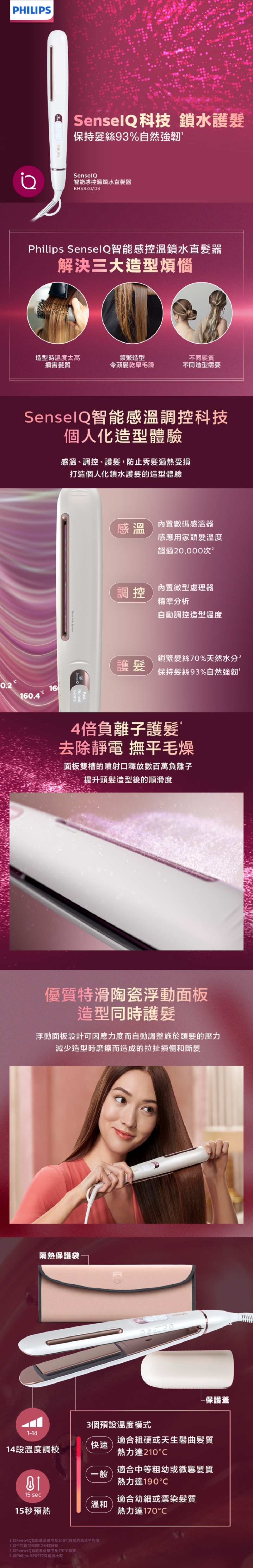 - SenseIQ智能感溫調控科技,以數碼感溫器及智能微型處理器,精準分析並因應髮質自動調控造型溫度,防止秀髮過熱受損,打造個人化鎖水護髮的造型體驗: