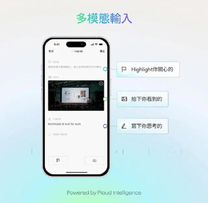 Plaud 同步整合語音、文字、圖片與重點,透過LLM 技術生成完整清晰的摘要。