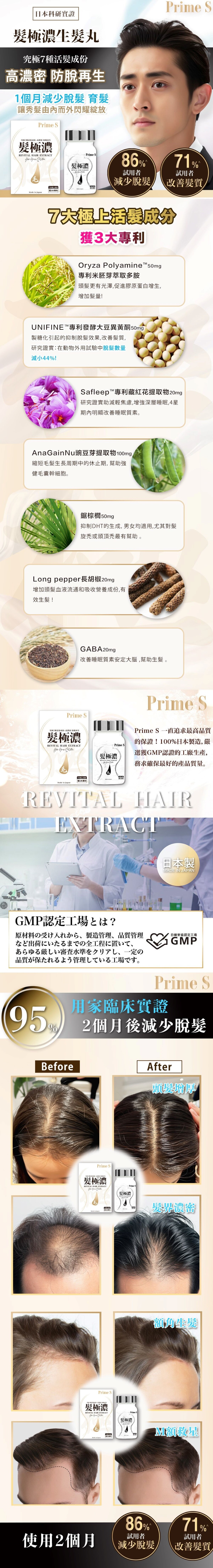 「Prime S 髮極濃生髮丸」係日本嘅頂級生髮神物,7大活髮成分加3大專利獎,保證你頭髮變得濃密又光澤!