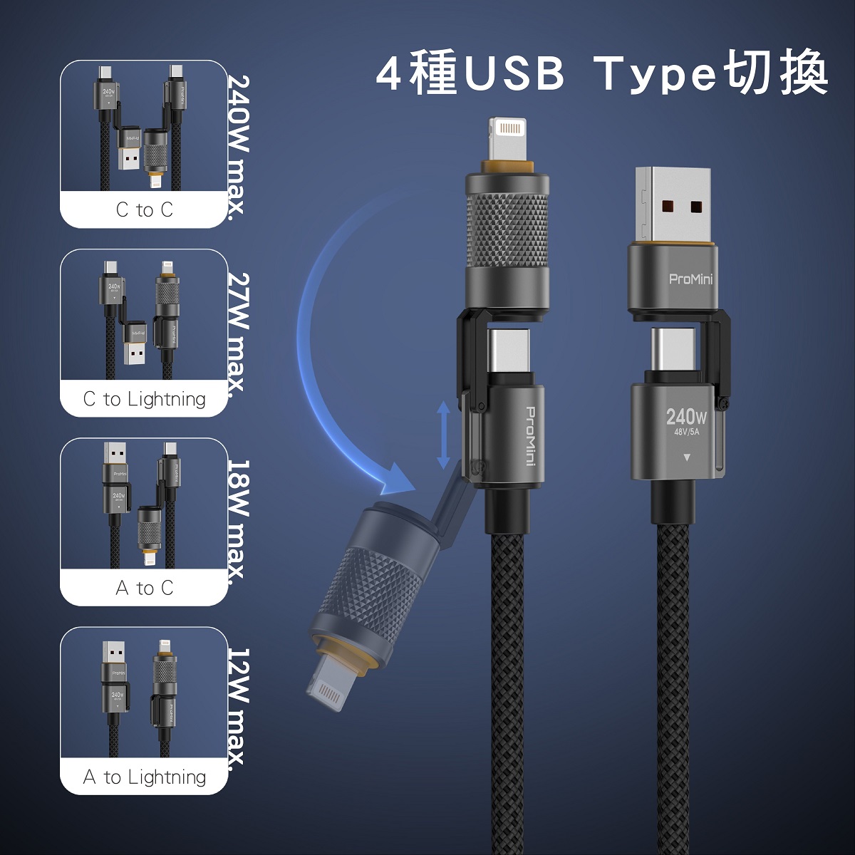 - 4種USB Type切換 - C to C、C to Lightning、A to C、A to Lightning