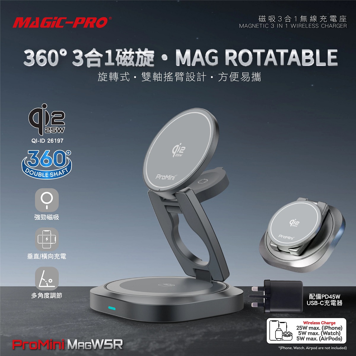 ProMini - MagW5R 35W Qi2.2認證 磁吸三合一360°摺疊式無線充電座 (連火牛)