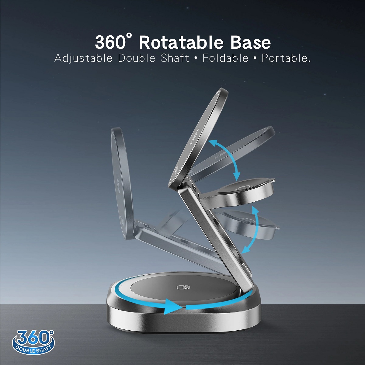 - 360度旋轉底座,摺疊式雙軸搖臂,方便易攜