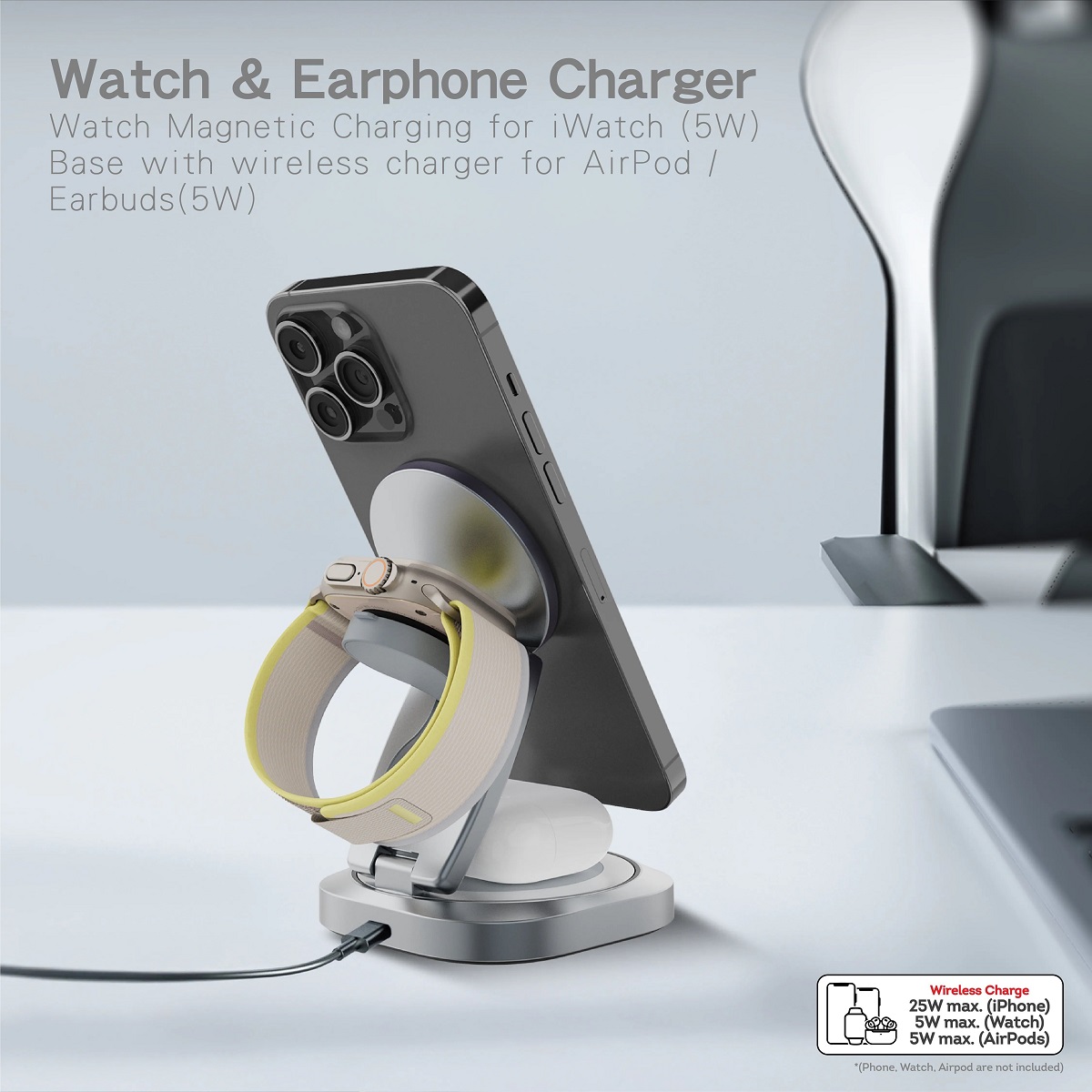 - 可同時為 iPhone/Galaxy Z Fold/Z Flip/S,iWatch,AirPods/Earbuds 進行無線充電