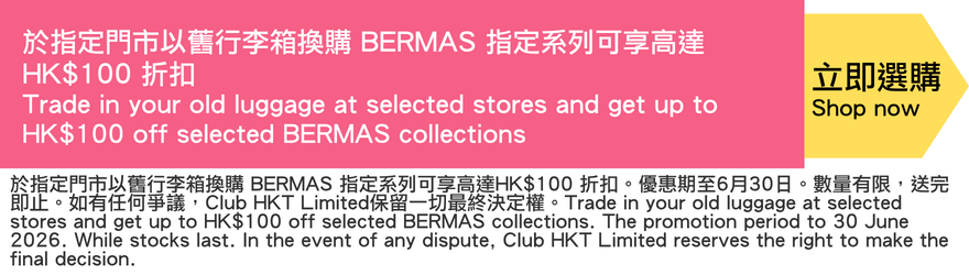 3.客人需出示電子換領信及相關的電子禮券, 並攜帶任何品牌旅行箱, 以優惠價換購指定BERMAS 旅行箱, 以一換一形式即場取貨, 不設送貨。逾期作廢。