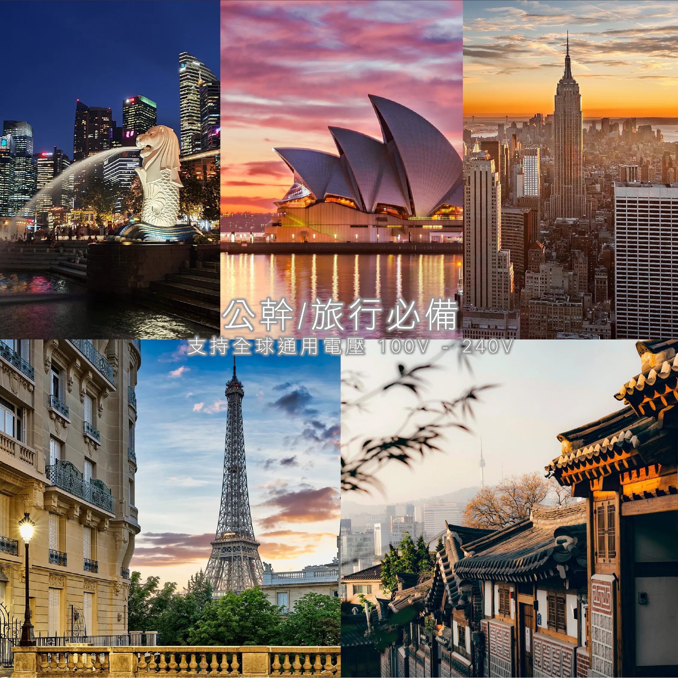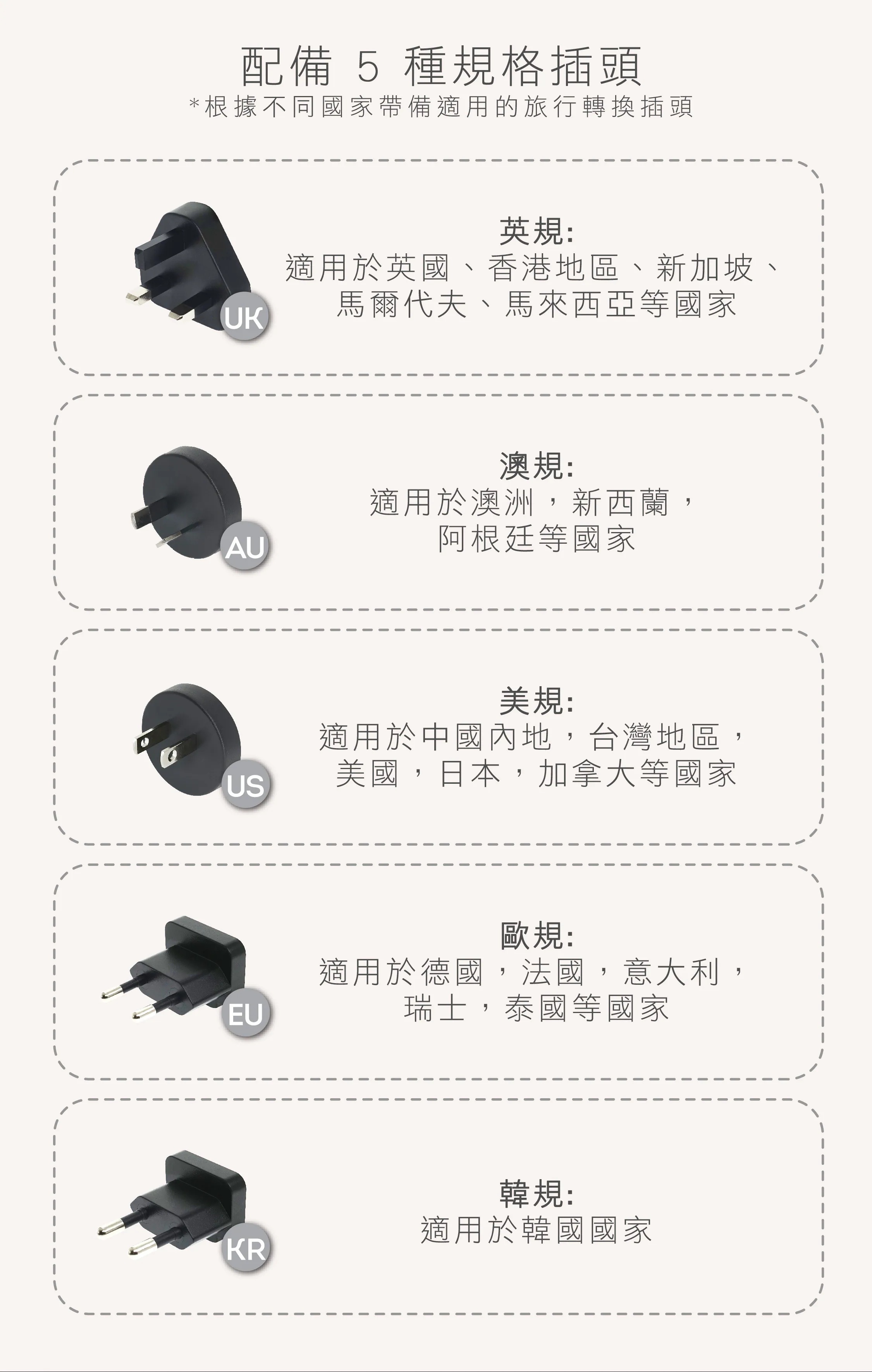 - 配備(英、美、歐、澳、韓)轉換插頭,全球通用電壓100V-240V