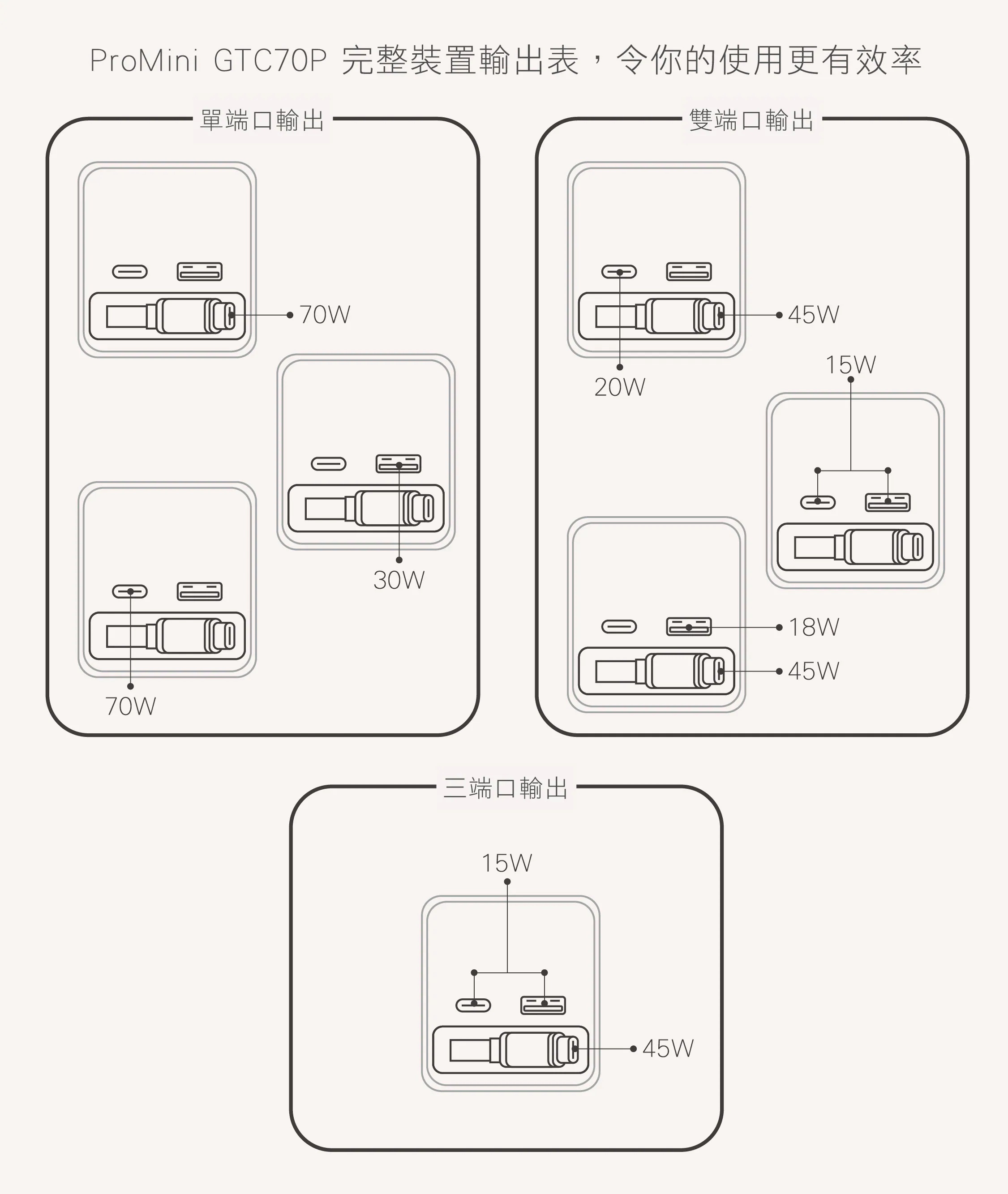 USB-C1線+(USB-C2+USB-A): 45W+(15W-5V⎓3A) 60W max. - 總輸出 70W max.