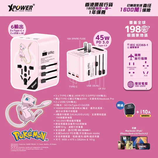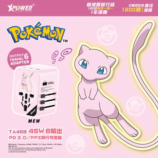 XPower x Pokémon 夢幻 TA45B 45W 6輸出 PD3.0/PPS快充旅行充電器