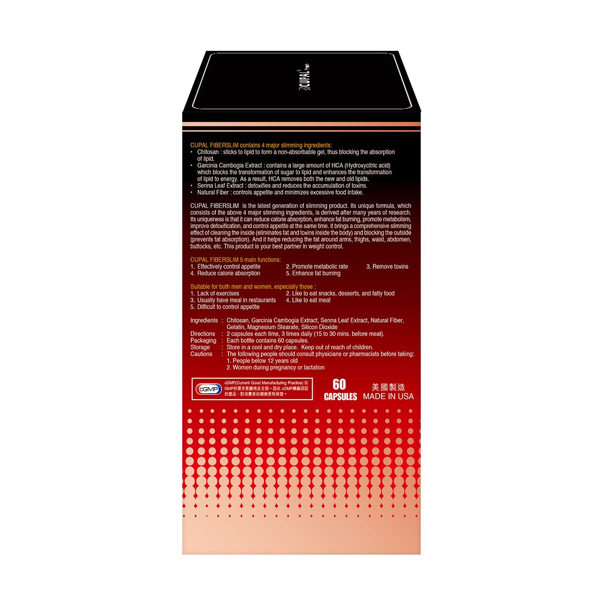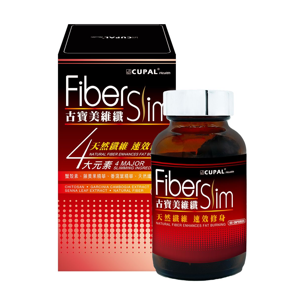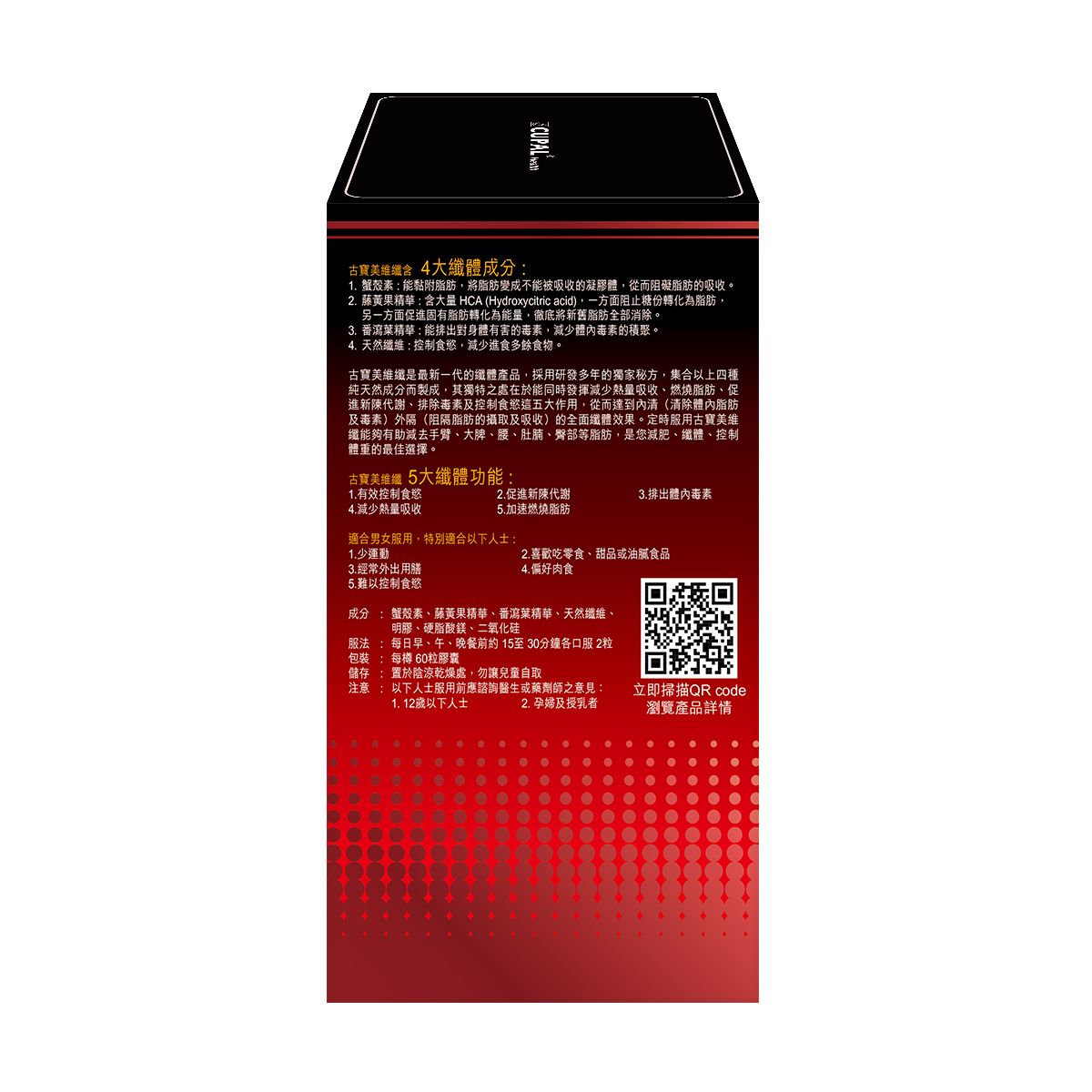 - 蟹殼素、藤黃果精華、番瀉葉精華、天然纖維、明膠、硬脂酸鎂、二氧化硅