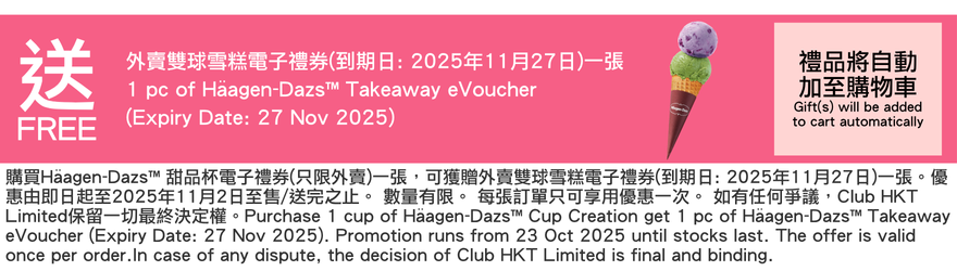 - 憑相關的電子禮券可免費換取Häagen-Dazs™外賣甜品杯一客