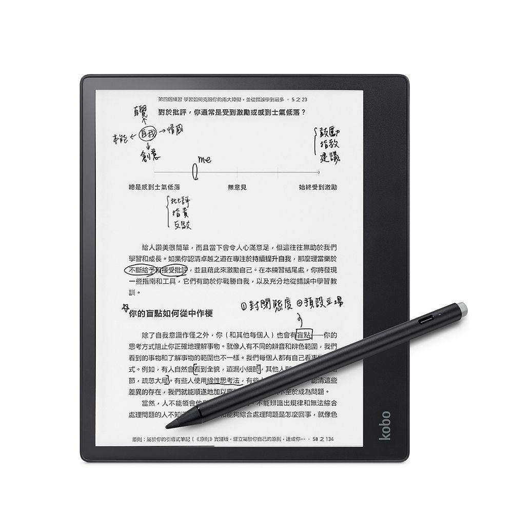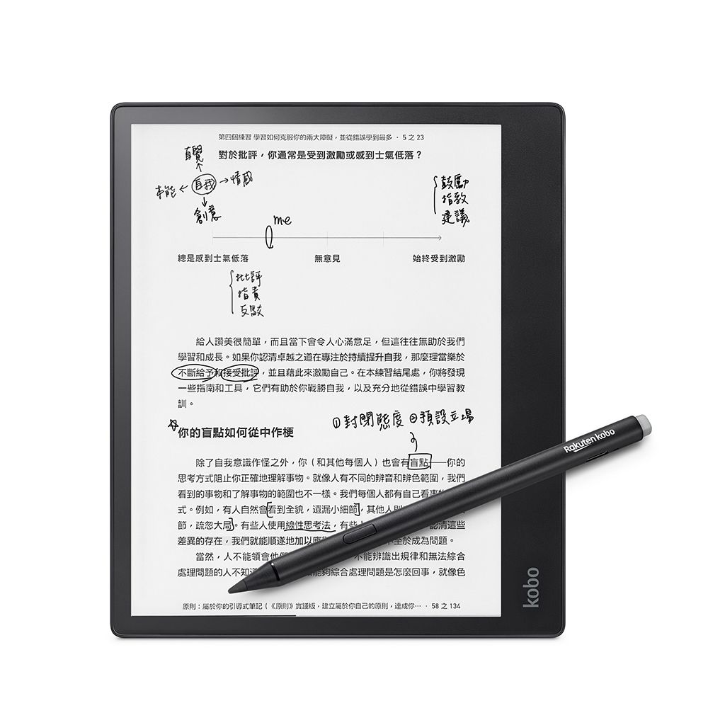 -全新 Kobo Stylus 2,符合人體工學設計且可充電,手寫體驗更加流暢順手。使用筆端的橡皮擦修改錯誤,和螢光筆快捷鍵標記重點。