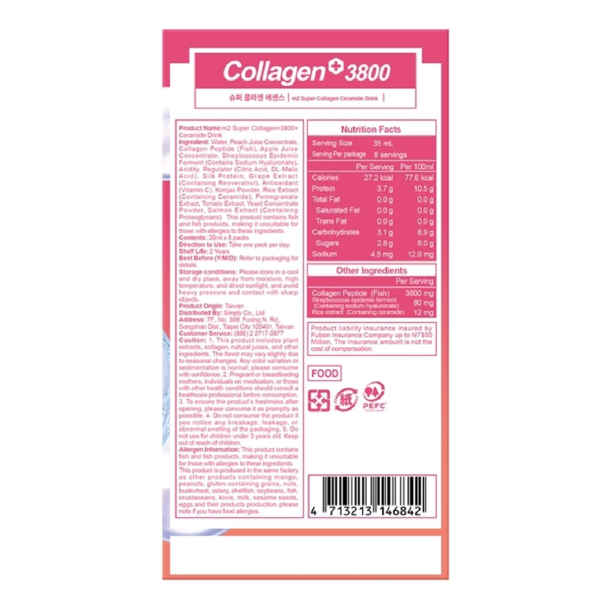 水、蜜桃濃縮汁、魚膠原蛋白肽、蘋果濃縮汁、流行鏈球菌發酵物(含透明質酸鈉)、酸度調節劑(檸檬酸、DL-蘋果酸)、蠶絲蛋白、葡萄萃取物(含白藜蘆醇)、抗氧化劑(維生素C)、蒟蒻粉、玄米萃取物(含神經醯胺)、石榴萃取物、番茄萃取物、酵母濃縮粉、鮭魚抽出物(含蛋白聚醣) 。本產品含魚類及魚類製品,對其過敏者請勿食用。