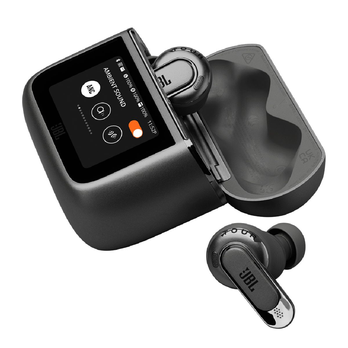 讓手機安心待在口袋。 JBL Tour Pro 3 全新設計的智慧充電保護盒 Smart Charging CaseTM 擁有您所需的所有功能,支援多種語言,讓您直接從充電盒上全面控制和自訂聆聽體驗及耳塞設定。使用更大、更清晰的 1.57 吋觸控屏,查看正在播放的歌曲或來電訊息,還可以用您喜歡的照片個性化設定觸控螢幕。直接存取您的 Spotify 帳戶,查看時間,或設定鬧鐘。查看動態鎖定屏,取得電池狀態、時間、訊息等資訊。