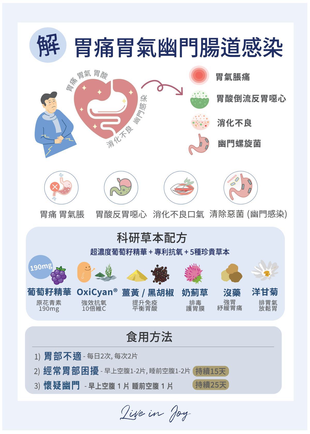 - 幽門螺旋菌不適:起床後一粒,睡前一粒,每日兩次,連續服用25天